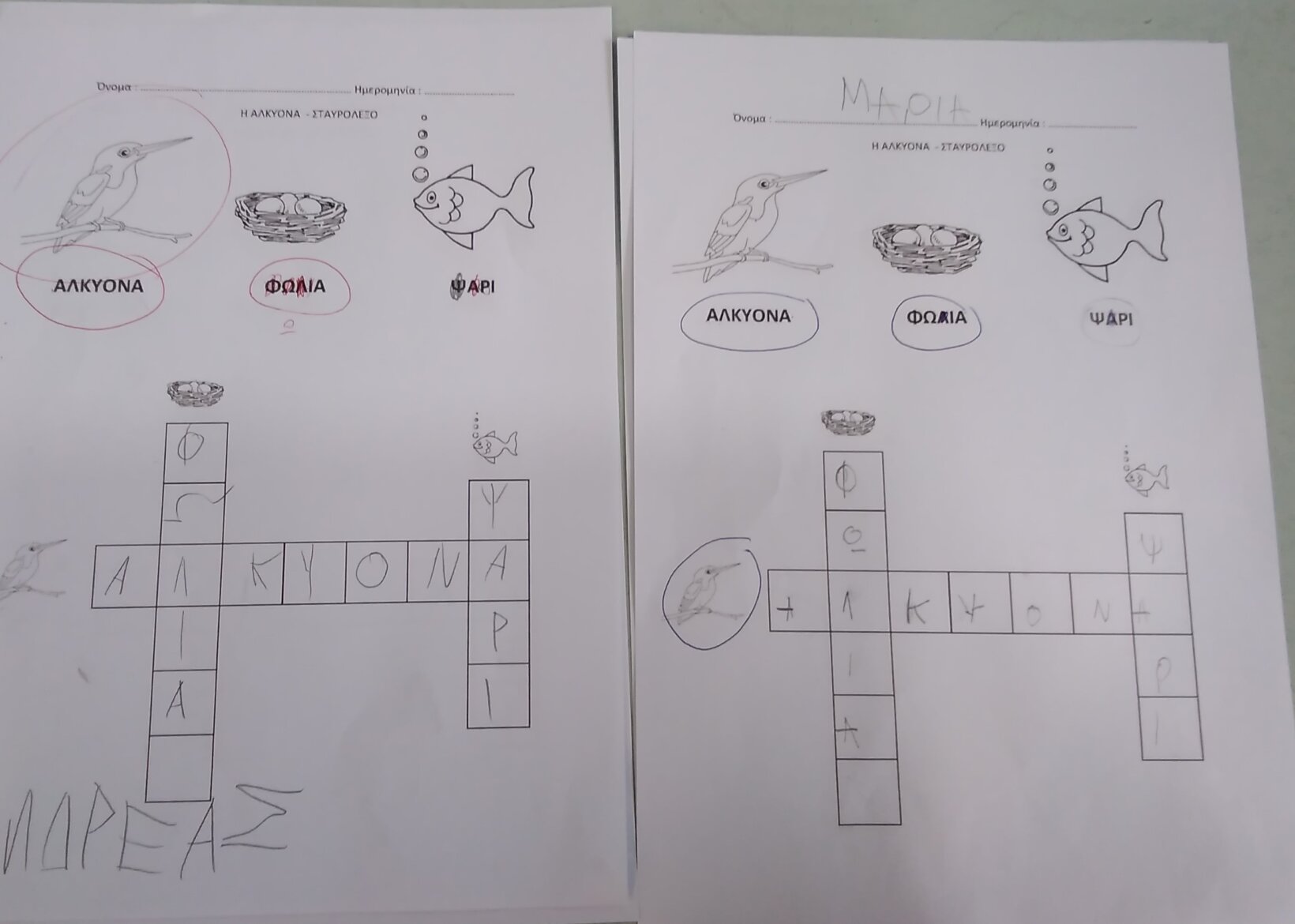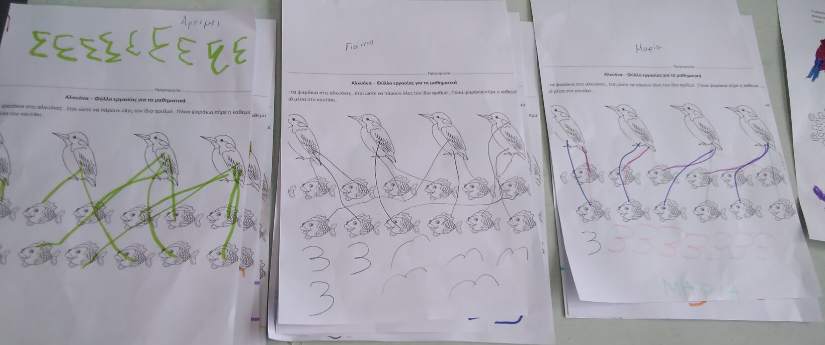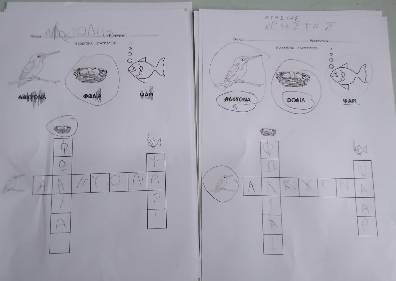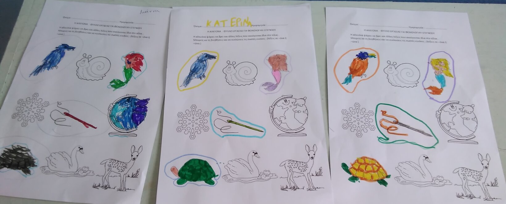 Τα παιδιά ζωγράφισαν τον μύθο, ζωγράφισαν την αλκυόνη πουλί σε έτοιμο φύλλο εργασίας έγραψαν όπως μπορούν την λέξη αλκυόνη, συμπλήρωσαν φύλλα εργασίας γλώσσας και μαθηματικών και δημιούργησαν πίνακα ζωγραφικής σχετικές με το θέμα.