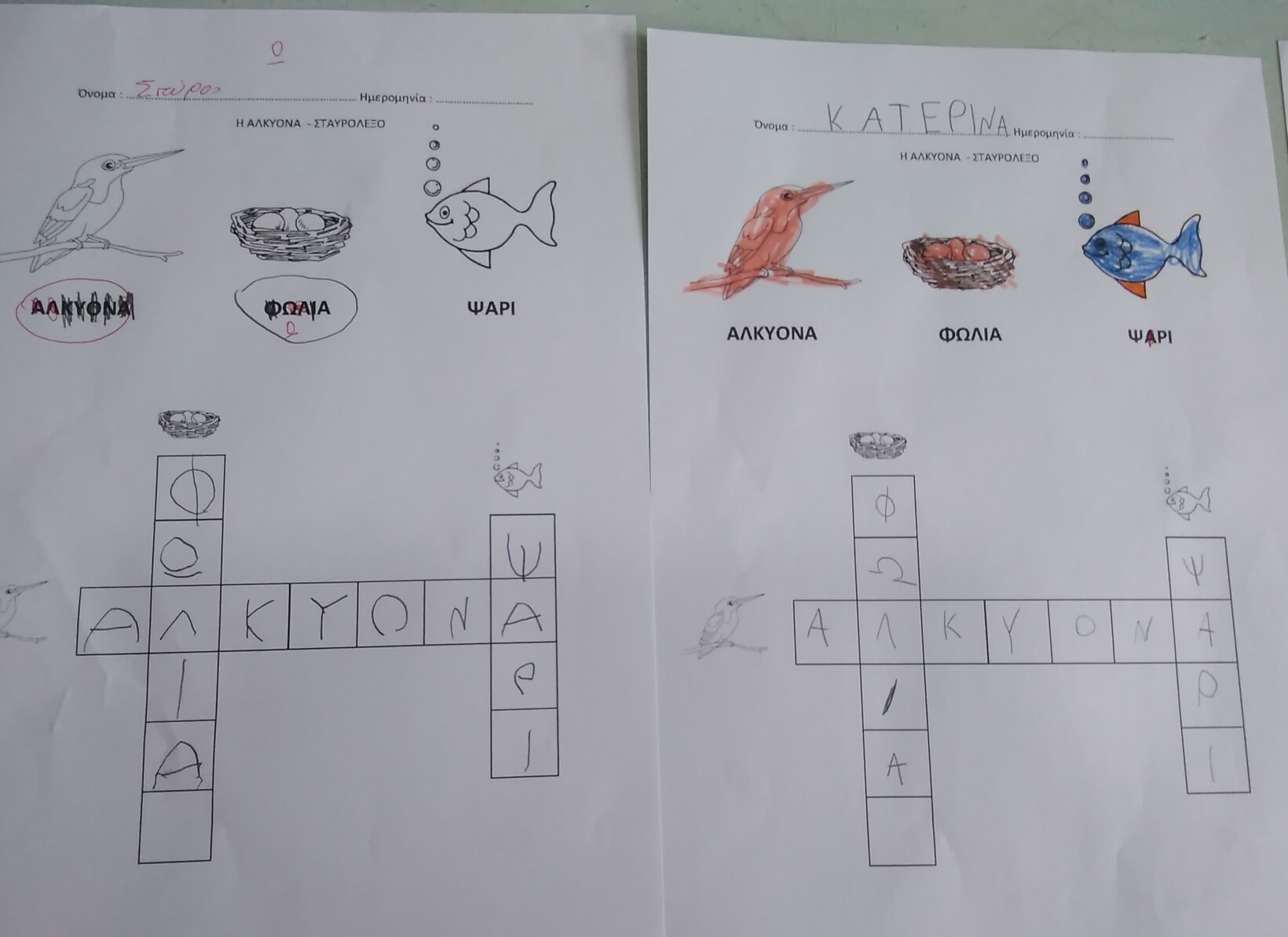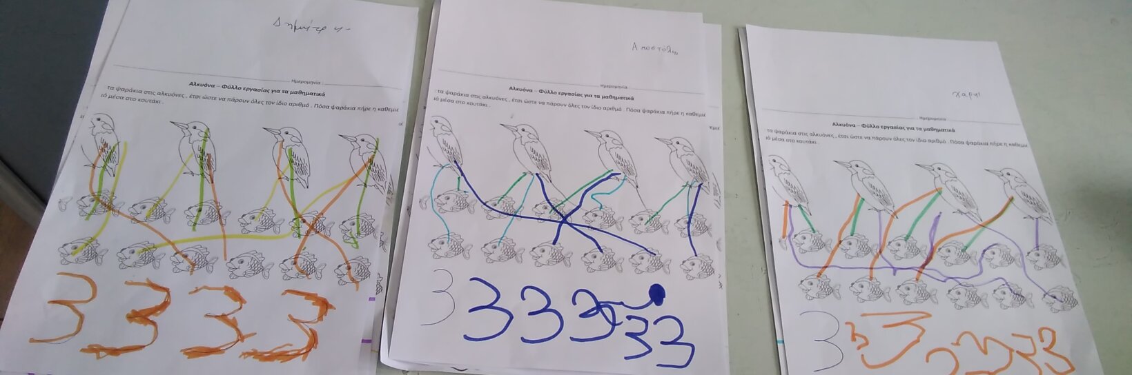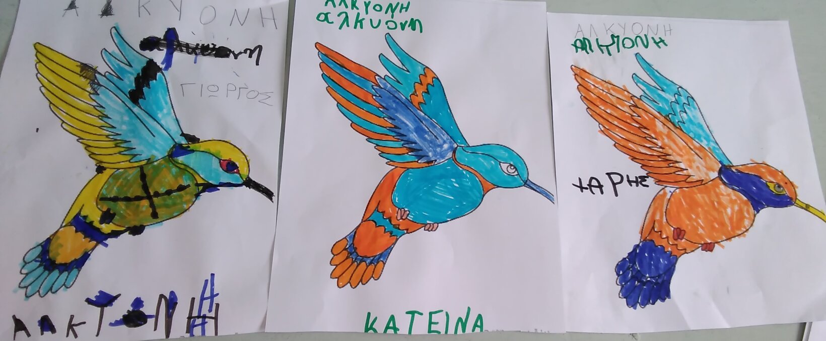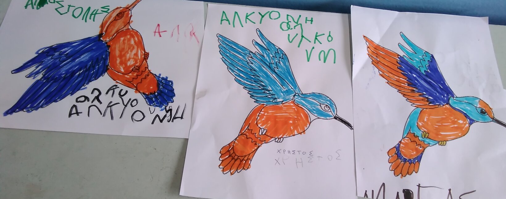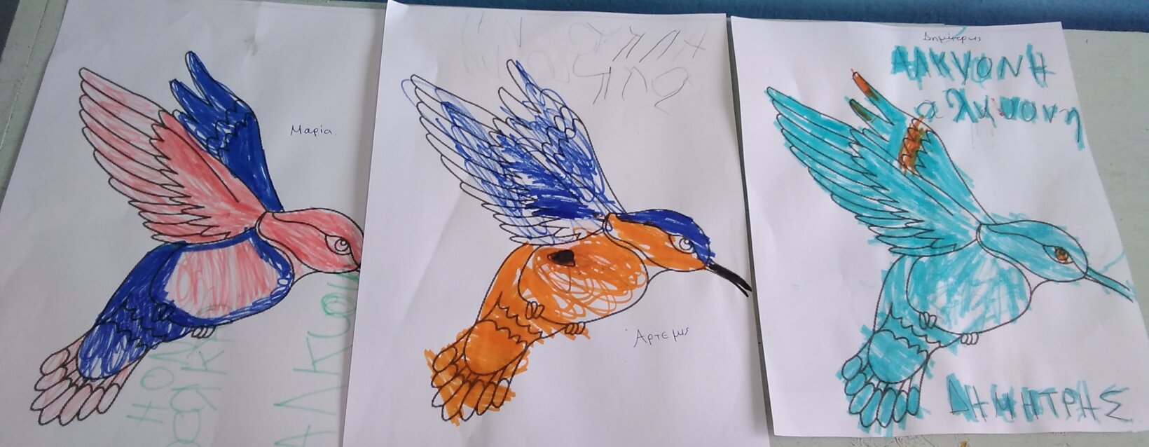 Τα παιδιά ζωγράφισαν τον μύθο, ζωγράφισαν την αλκυόνη πουλί σε έτοιμο φύλλο εργασίας έγραψαν όπως μπορούν την λέξη αλκυόνη, συμπλήρωσαν φύλλα εργασίας γλώσσας και μαθηματικών και δημιούργησαν πίνακα ζωγραφικής σχετικές με το θέμα.