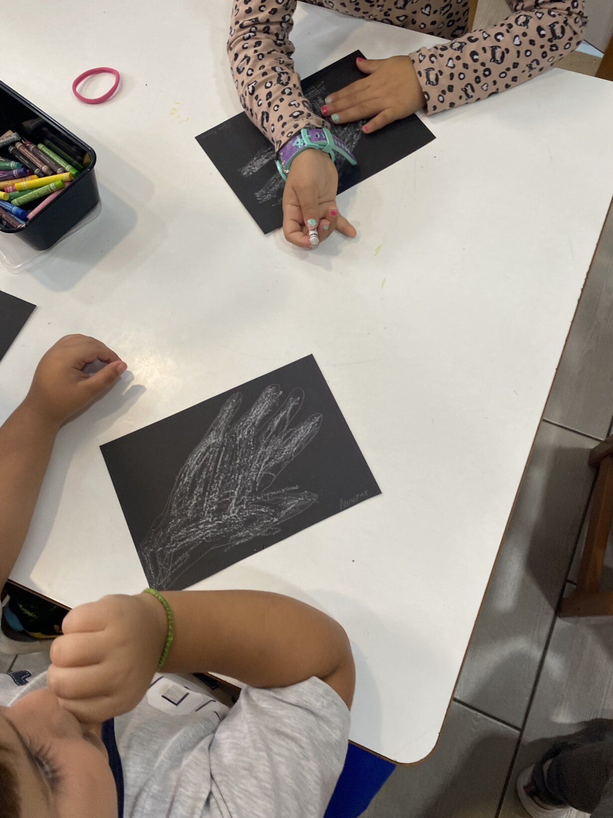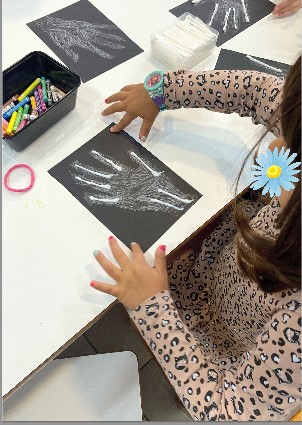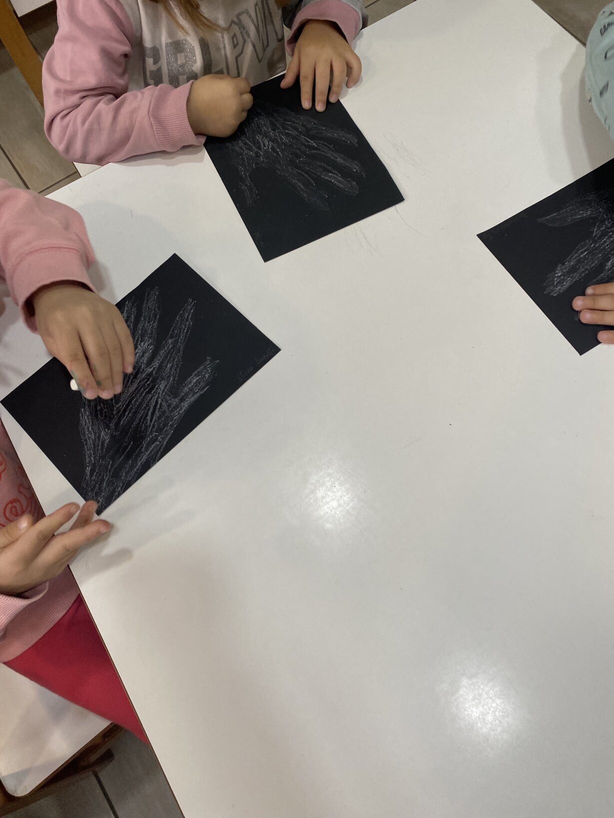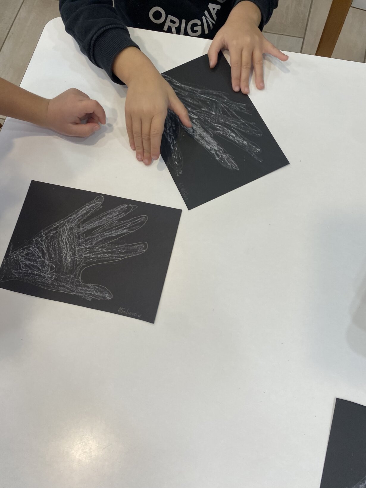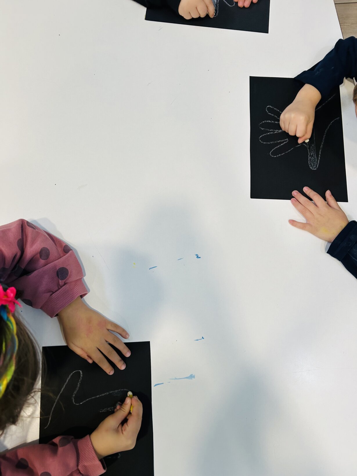 - Τα παιδιά τοποθετούν το χέρι τους πάνω στο μαύρο χαρτόνι και σχηματίζουν το περίγραμμα του χεριού τους.
