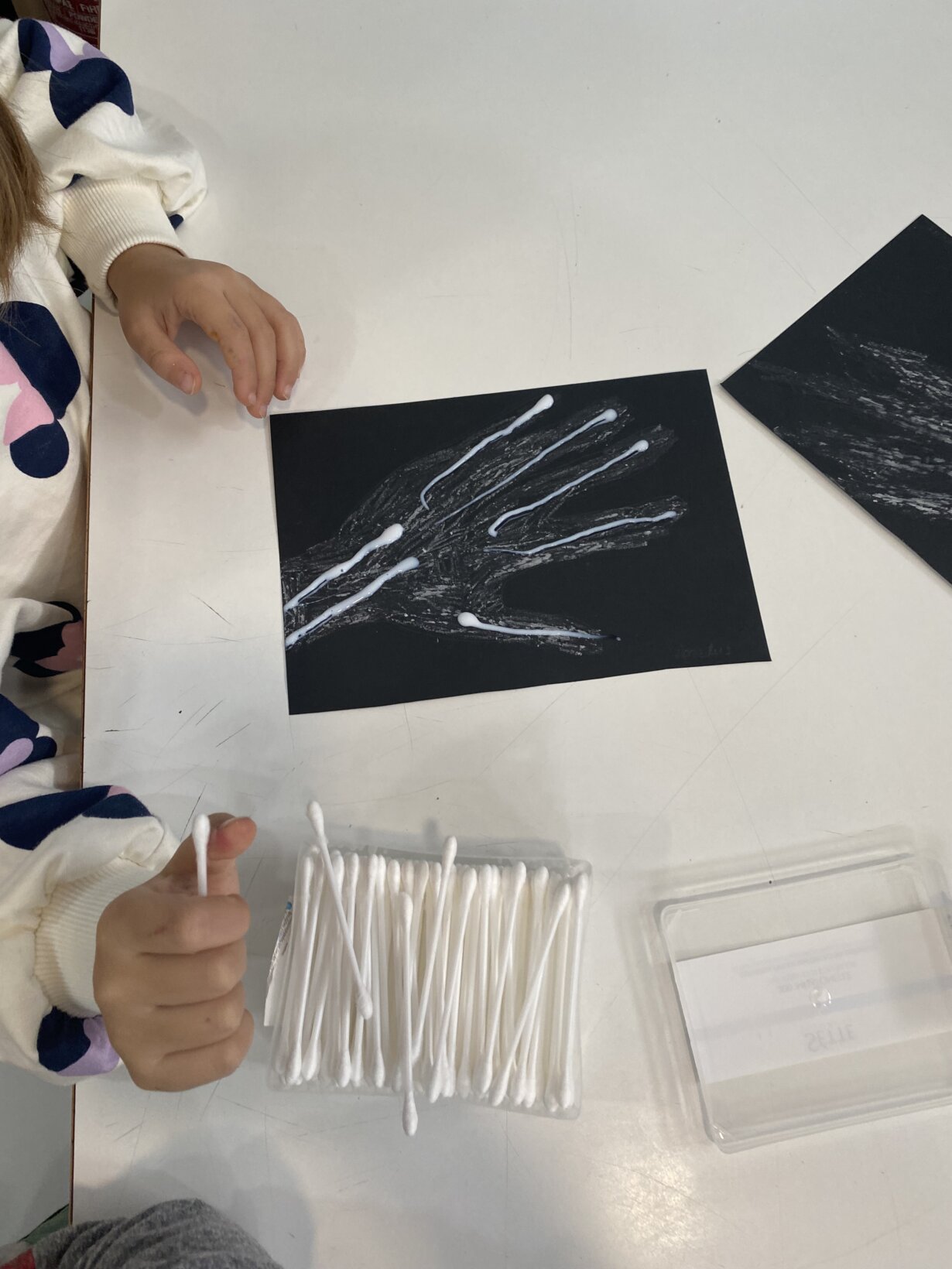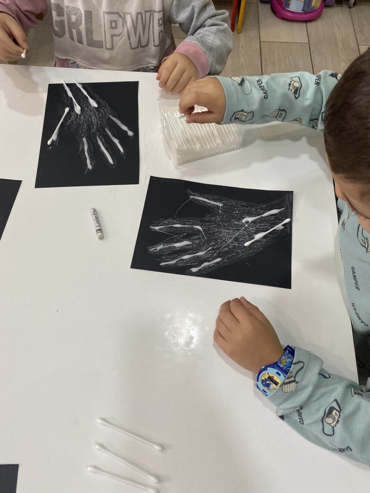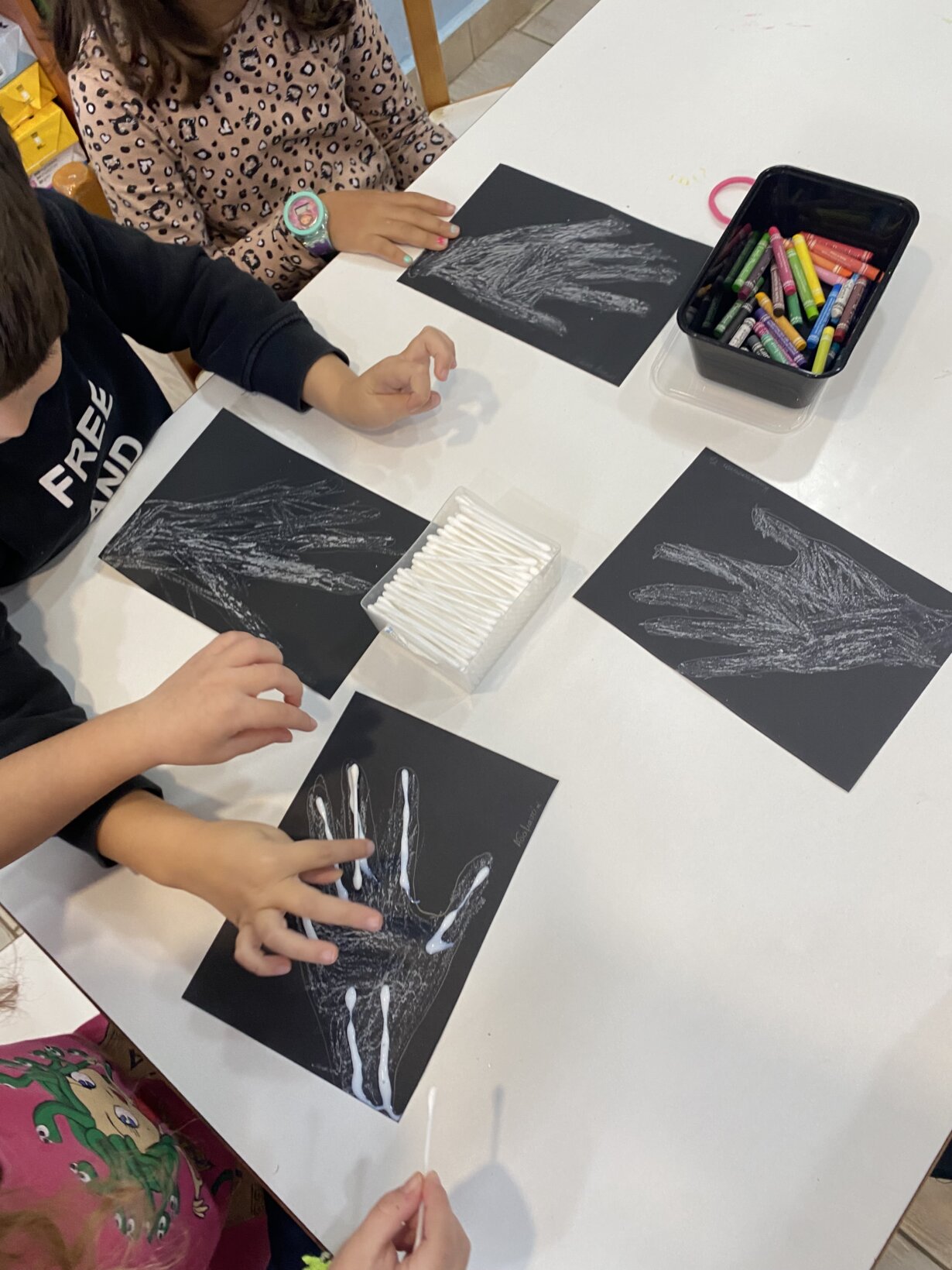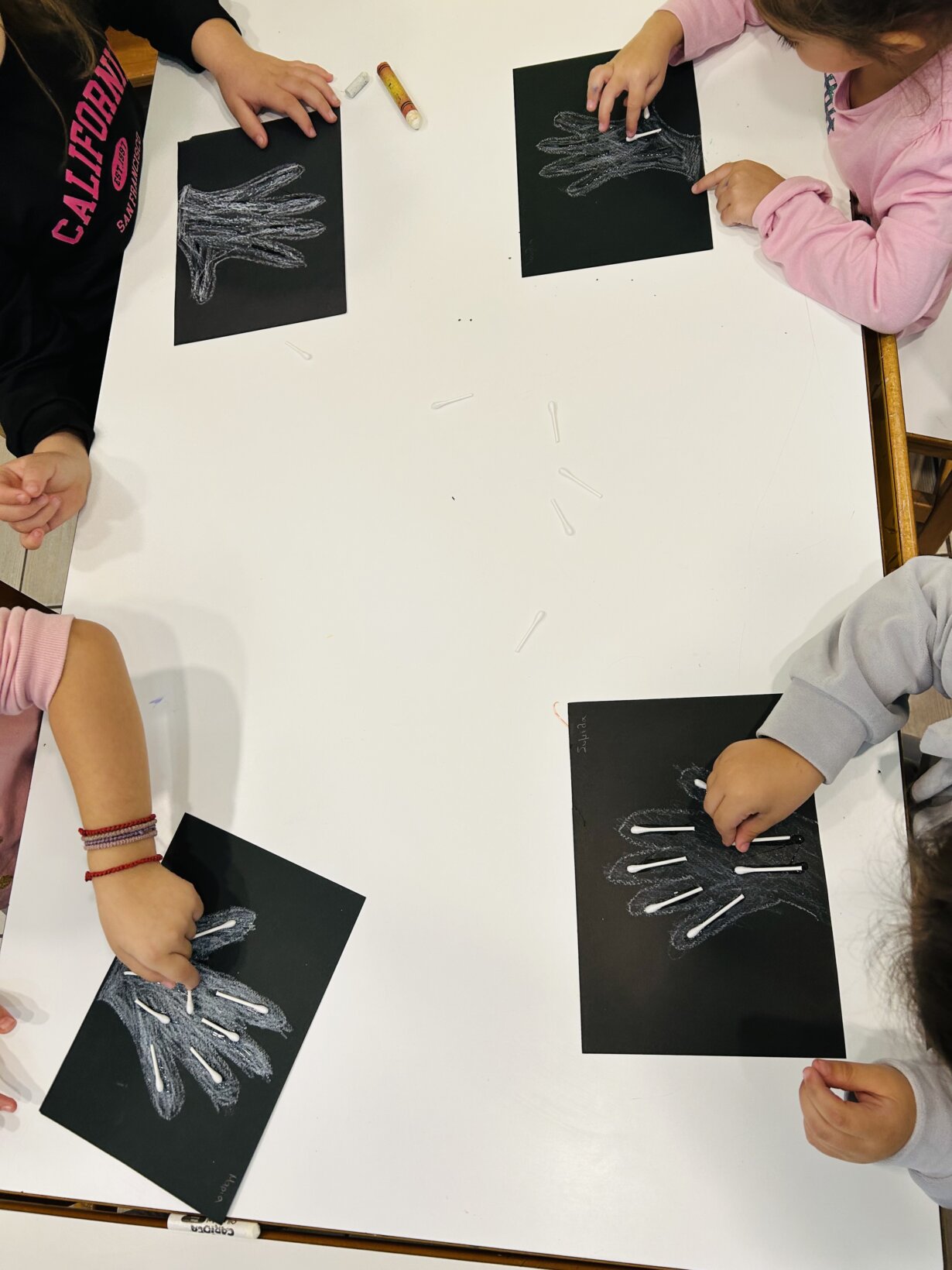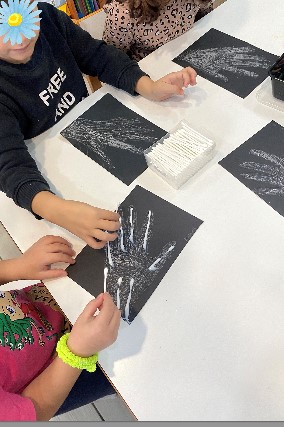 - Τα παιδιά τοποθετούν το χέρι τους πάνω στο μαύρο χαρτόνι και σχηματίζουν το περίγραμμα του χεριού τους.