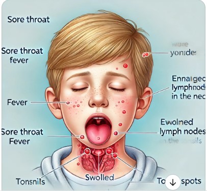 - Ερυθρότητα και πρήξιμο στο λαιμό: Ο λαιμός μπορεί να εμφανίζεται κόκκινος, και οι αμυγδαλές μπορεί να έχουν πύον ή λευκές κηλίδες.