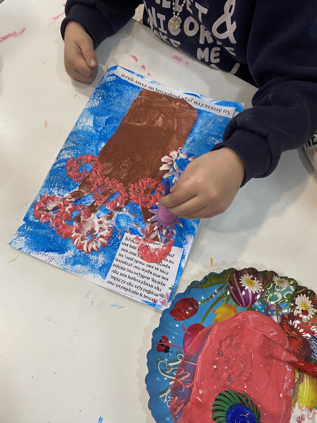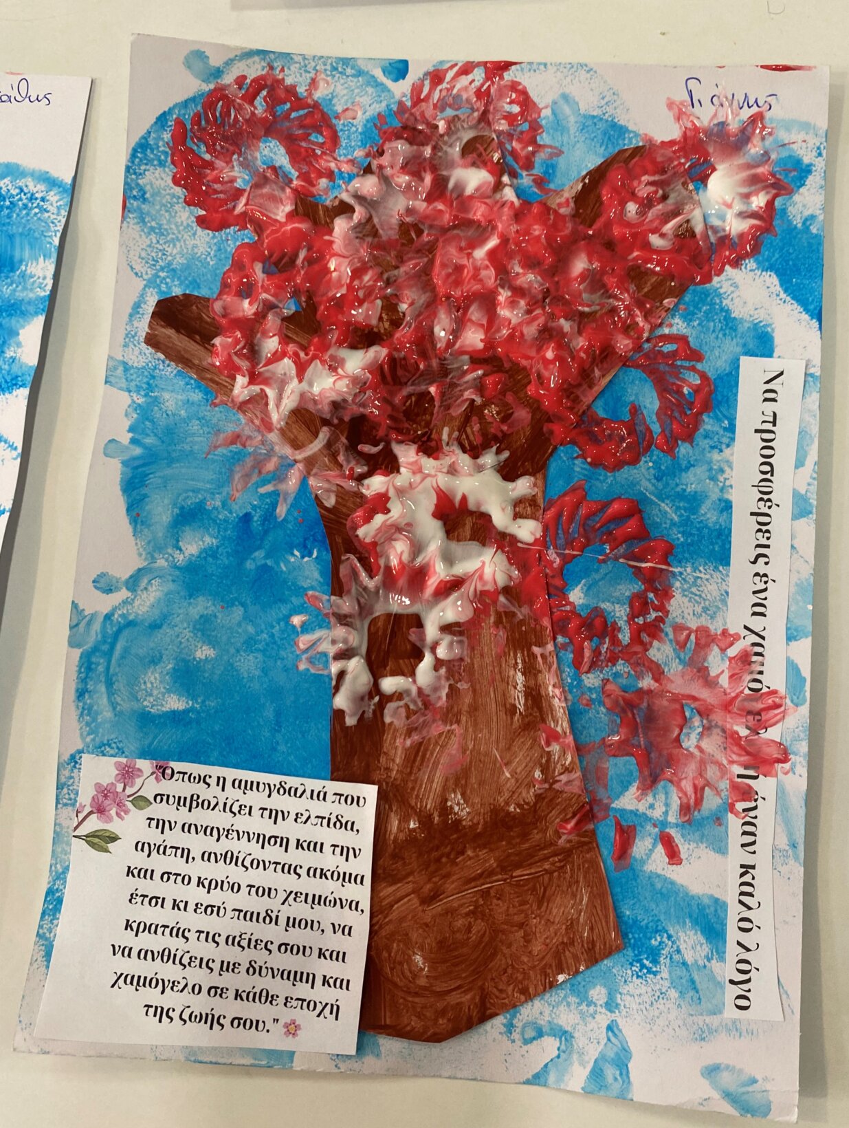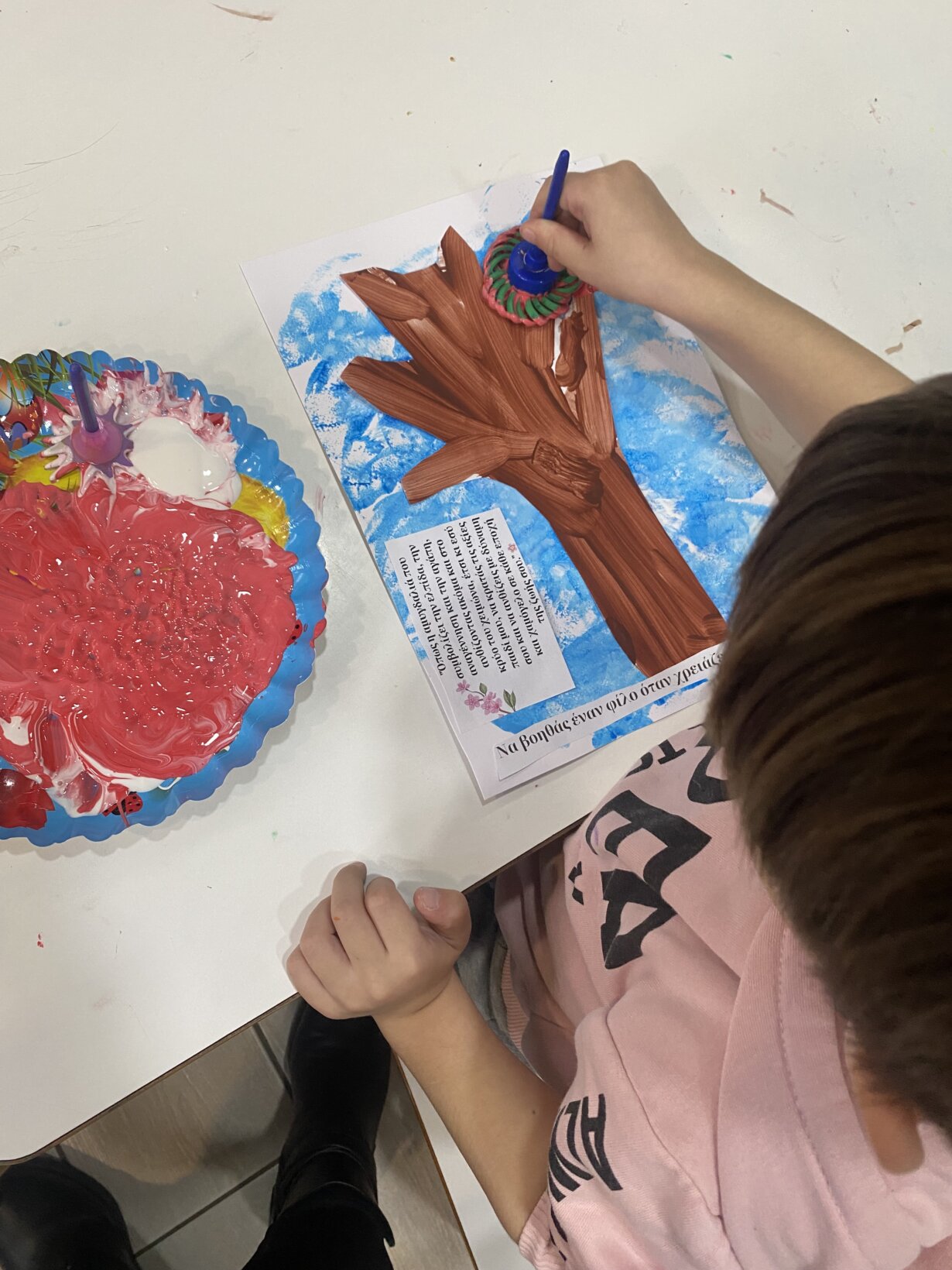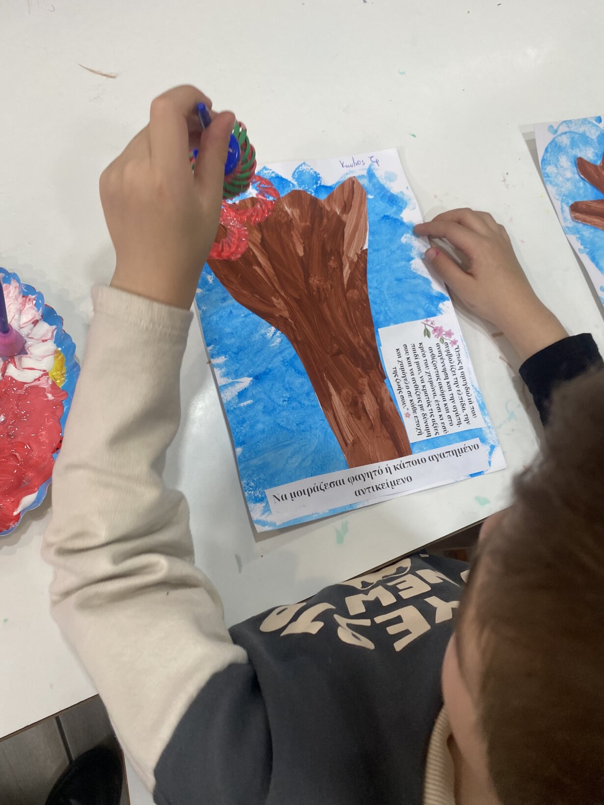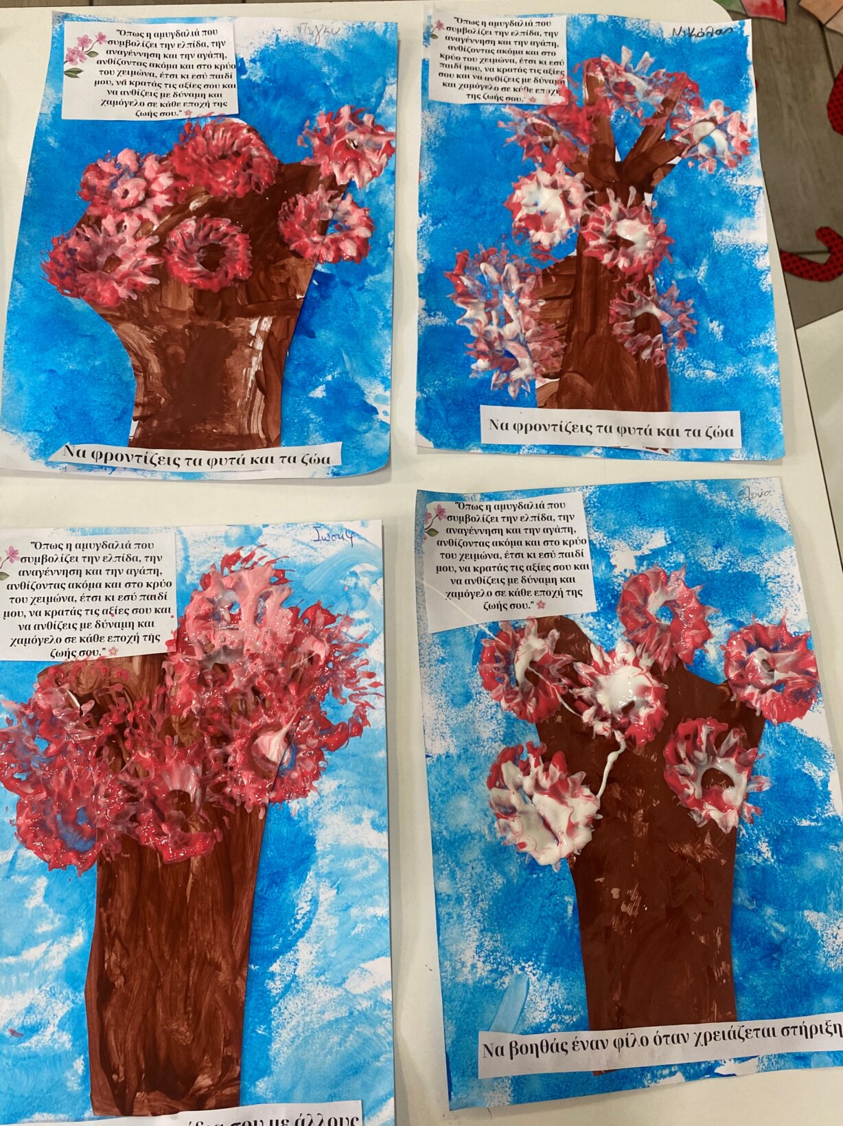 Τα παιδιά δημιουργούν το δικό τους “Δέντρο Αγάπης”, μια ανθισμένη αμυγδαλιά σε χαρτόνι, ζωγραφίζοντας με τέμπερες τα κλαδιά και τα άνθη. Το φόντο του ουρανού γίνεται καμβάς για μια πράξη φροντίδας που γράφουν τα ίδια τα παιδιά, είτε για το περιβάλλον είτε για τους ανθρώπους γύρω τους. Με αυτόν τον τρόπο, το δέντρο τους γεμίζει με πολύτιμες αξίες, συμβολίζοντας την ελπίδα, την αγάπη και την αναγέννηση.