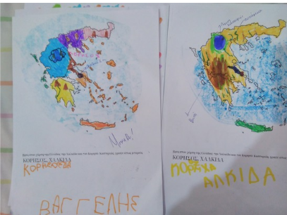 Χρησιμοποιήσαμε χάρτες για να εντοπίσουμε πού βρίσκεται το συνεργαζόμενο νηπιαγωγείο. Τα παιδιά παρατήρησαν την απόσταση ανάμεσα στις δύο πόλεις και συζητήσαμε για το πώς μπορεί να είναι η περιοχή όπου ζουν οι φίλοι μας.