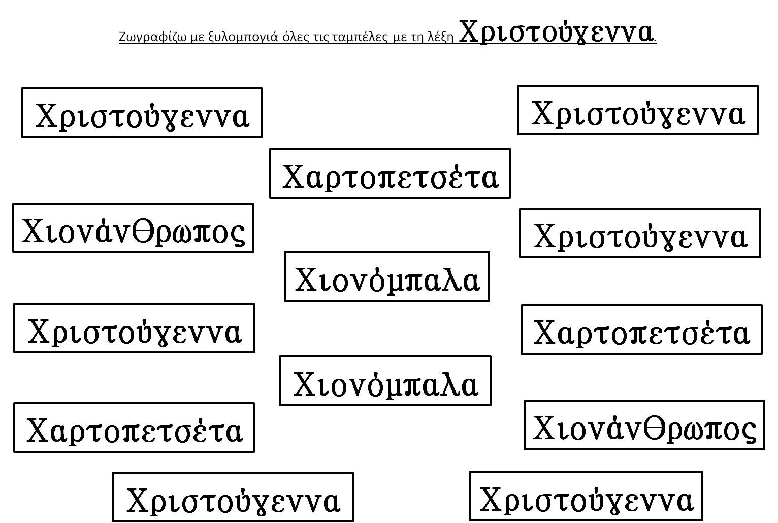 Στη συνέχεια γίναμε ντεντέκτιβς χριστουγεννιάτικων καρτελών.Πού πήγαν και μπερδεύτηκαν οι καρτέλες με τη λέξη “Χριστούγεννα”; Τις ξεχωρίσαμε ,βάφοντας τες με ξυλομπογιά, από αυτές που έγραφαν χαρτοπετσέτα,χιονάνθρωπος και χιονόμπαλα. Τις καταμετρήσαμε και τις βρήκαμε 6 όπως ακριβώς μας αποκαλύφθηκε στην πορεία της εργασίας.