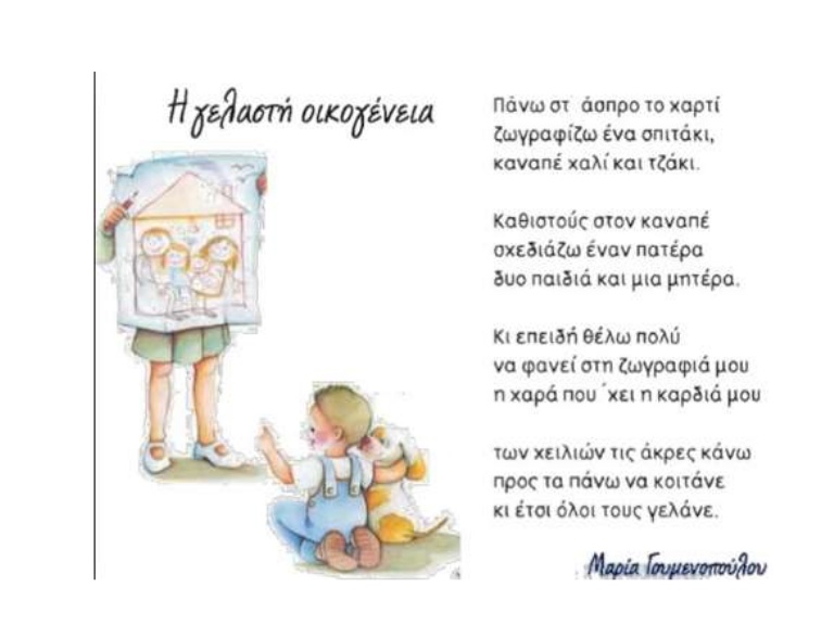 Συνεχίζοντας την ανάπτυξη της θεματικής μας για την οικογένεια (εδώ και εδώ) επεξεργαστήκαμε το ποίημα της Γουμενοπούλου Μαρίας “Η γελαστή οικογένεια”.