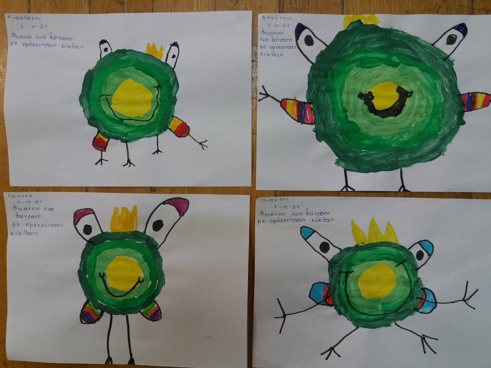 Συνεχίζοντας τη θεματική των σχημάτων, ανακαλύψαμε πώς μέσα από τον σχεδιασμό των ομόκεντρων κύκλων μπορούμε να δημιουργήσουμε διάφορες φιγούρες όπως είναι οι βάτραχοι. Επιπλέον, οι μαθητές/ μαθήτριες πειραματίστηκαν με τις αποχρώσεις των χρωμάτων δίνοντας ο καθένας/η καθεμία έναν προσωπικό χαρακτήρα στο έργο!