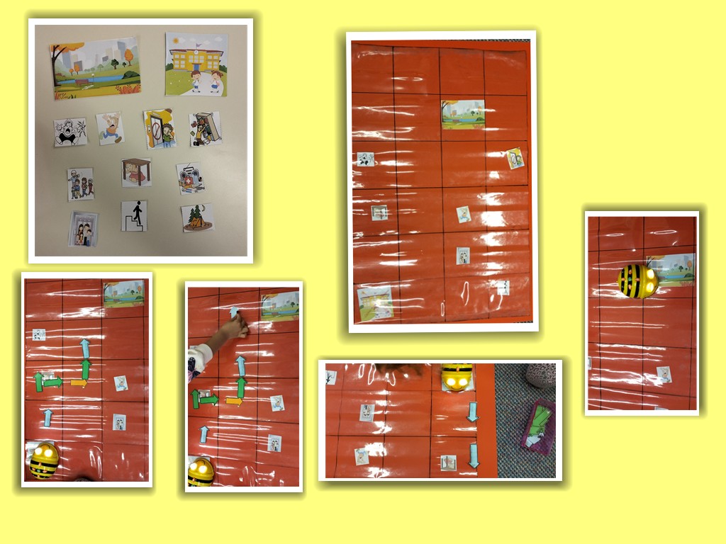 Στη συνέχεια χρησιμοποίησαν το ρομπότ Beebot και το προγραμμάτισαν να περπατήσει πάνω στο τετραγωνισμένο χαλί περνώντας από τις θετικές συμπεριφορές ώσπου να φτάσει στο χαρούμενο περιβάλλον του σχολείου. Στο τέλος , τα πιο έμπειρα παιδιά, δημιούργησαν και τον αλγόριθμο με τα βελάκια.