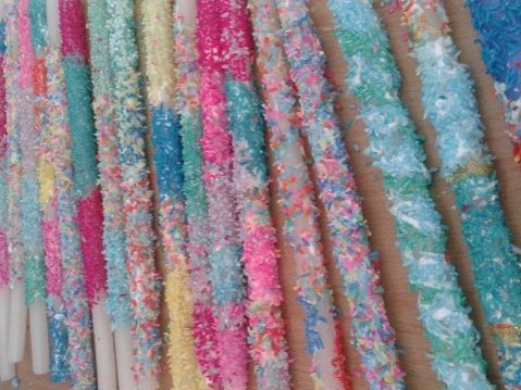 Σε μπολ με νερό βυθίζεις αρκετό γκοφρέ χαρτί στα χρώματα που επιθυμείς και το αφήνεις για μία ημέρα. Την άλλη μέρα ρίχνεις μέσα το ρύζι και το αφήνεις για λίγες ώρες. Κατόπιν το τοποθετείς σε απορροφητικό χαρτί , για να στραγγίξει τα νερά του…και το ψήνει η μαμά για λίγα λεπτά, για να στεγνώσει καλά. Περνάς ατλακόλ στη λαμπάδα, εκεί που θέλεις να κολλήσει το ρύζι. Μετά παίρνεις με τη χούφτα σου ρύζι και το ρίχνεις να κολλήσει στη λαμπάδα σου. Αν θέλεις προσθέτεις ασημόσκονη ή χρυσόσκονη. Την αφήνεις να στεγνώσει και περνάς μια στρώση ατλακόλ και πάλι, για να σταθεροποιηθεί το ρύζι.