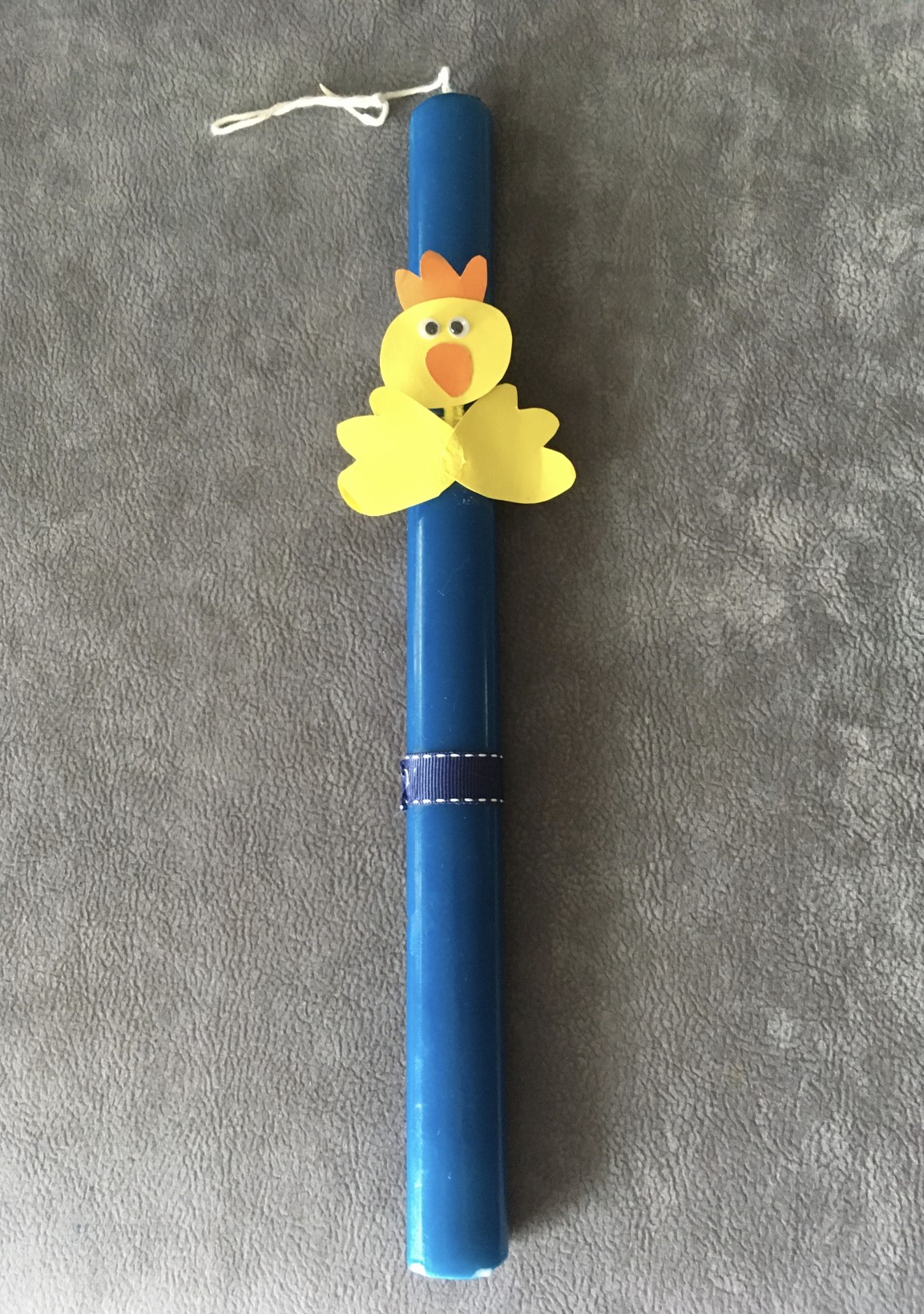 Στάζεις σε λαδόκολλα τα χρώματα που διάλεξες και κυλάς τη λαμπάδα σου πάνω στην τέμπερα. Αφήνεις να στεγνώσει και στη συνέχεια η μαμά περνάει μια στρώση ατλακόλ, για να μην ξεφλουδίζεται η τέμπερα. Μόλις στεγνώσει η ατλακόλ, δένεις κορδέλες χρωματιστές……κολλάς το κοτοπουλάκι σου ή ότι άλλο θέλεις.