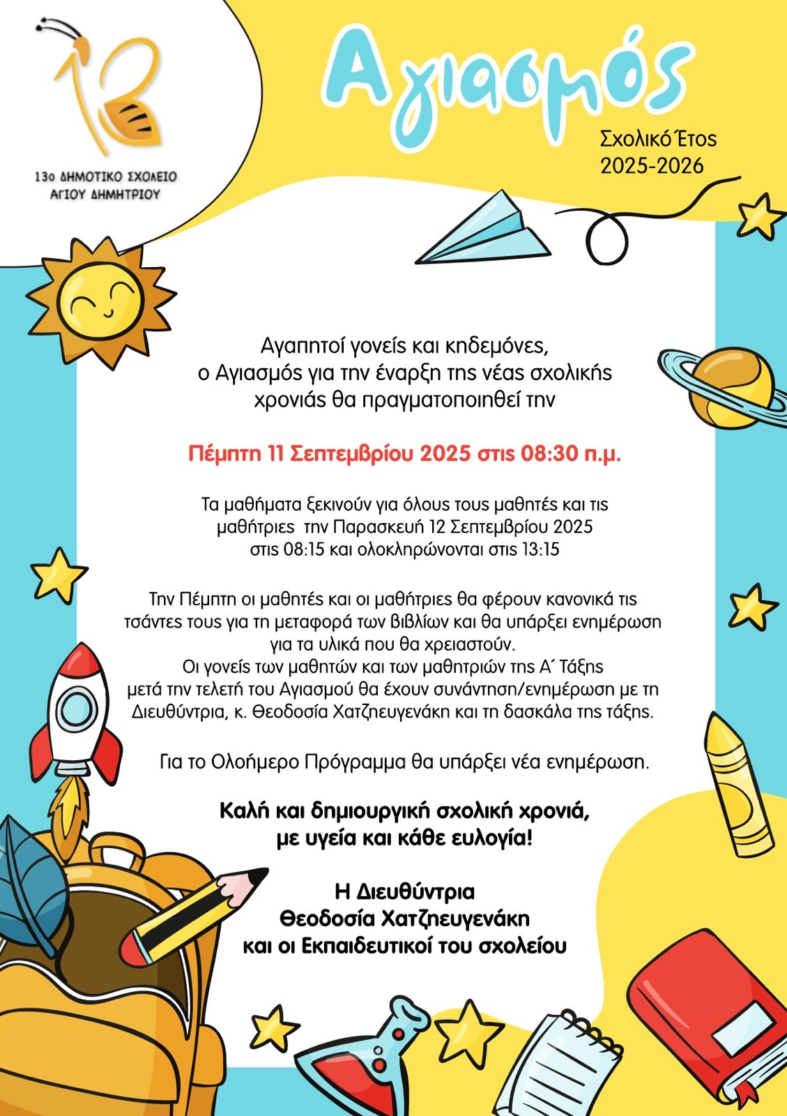 Η Διευθύντρια και οι Εκπαιδευτικοί του 13ου ΔΣ Αγίου Δημητρίου