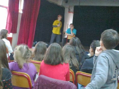 Την Παρασκευή 7 Μαρτίου 2014 οι μαθητές και οι μαθήτριες των Δ’, Ε’ και Στ’ τάξεων παρακολούθησαν στην αίθουσα εκδηλώσεων του σχολείου μας την παιδική/εφηβική παράσταση «Ντόμπρε Ντεν», μια παραγωγή της θεατρικής ομάδας «Παπαλάνγκι» που πραγματοποιήθηκε σε συνεργασία με την Πειραματική Σκηνή της «Τέχνης». Πρόκειται για μια χιουμοριστική ιστορία που καλεί τα παιδιά να προβληματιστούν πάνω σε θέματα ρατσισμού και επιθετικότητας. Όπως αναφέρεται και στην ιστοσελίδα της πειραματικής σκηνής (http://www.piramatikiskini.gr/index.php/plays/details/ntompre-nten-b/) : «…δομείται μια χιουμοριστική αντιρατσιστική ιστορία, που την αφηγούνται και τη ζωντανεύουν τρεις ηθοποιοί με ελάχιστα σκηνικά μέσα και με πολλή φαντασία.»