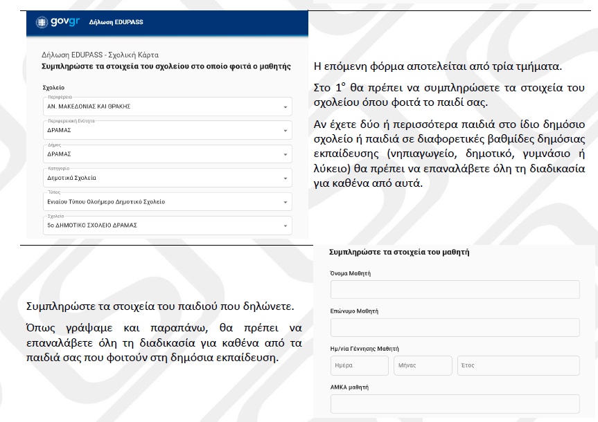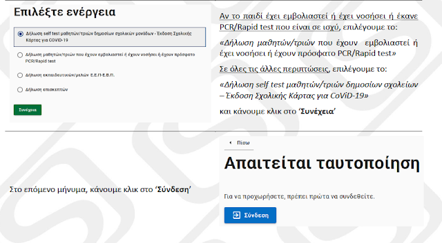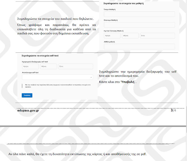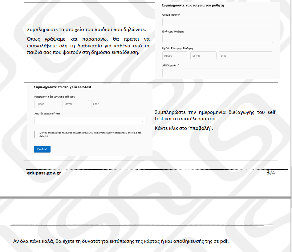 * η δήλωση και το αποτέλεσμα για τις δημόσιες σχολικές μονάδες καταχωρίζεται στη πλατφόρμα edupass.gov.gr (και όχι στην πλατφόρμα του self-testing.gov.gr), από την οποία εκδίδεται και η Σχολική Κάρτα για COVID-19