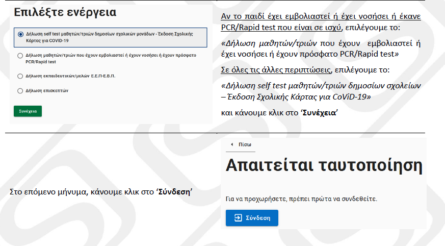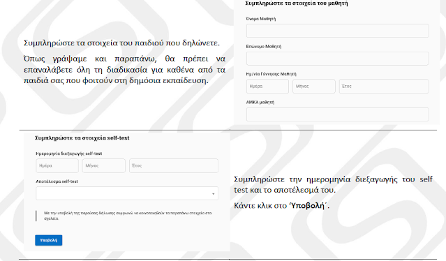 * βεβαίωση αρνητικού self test οφείλουν να φέρουν όλοι οι μαθητές από 4 έως 18 ετών καθώς και οι εμβολιασμένοι εκπαιδευτικοί.