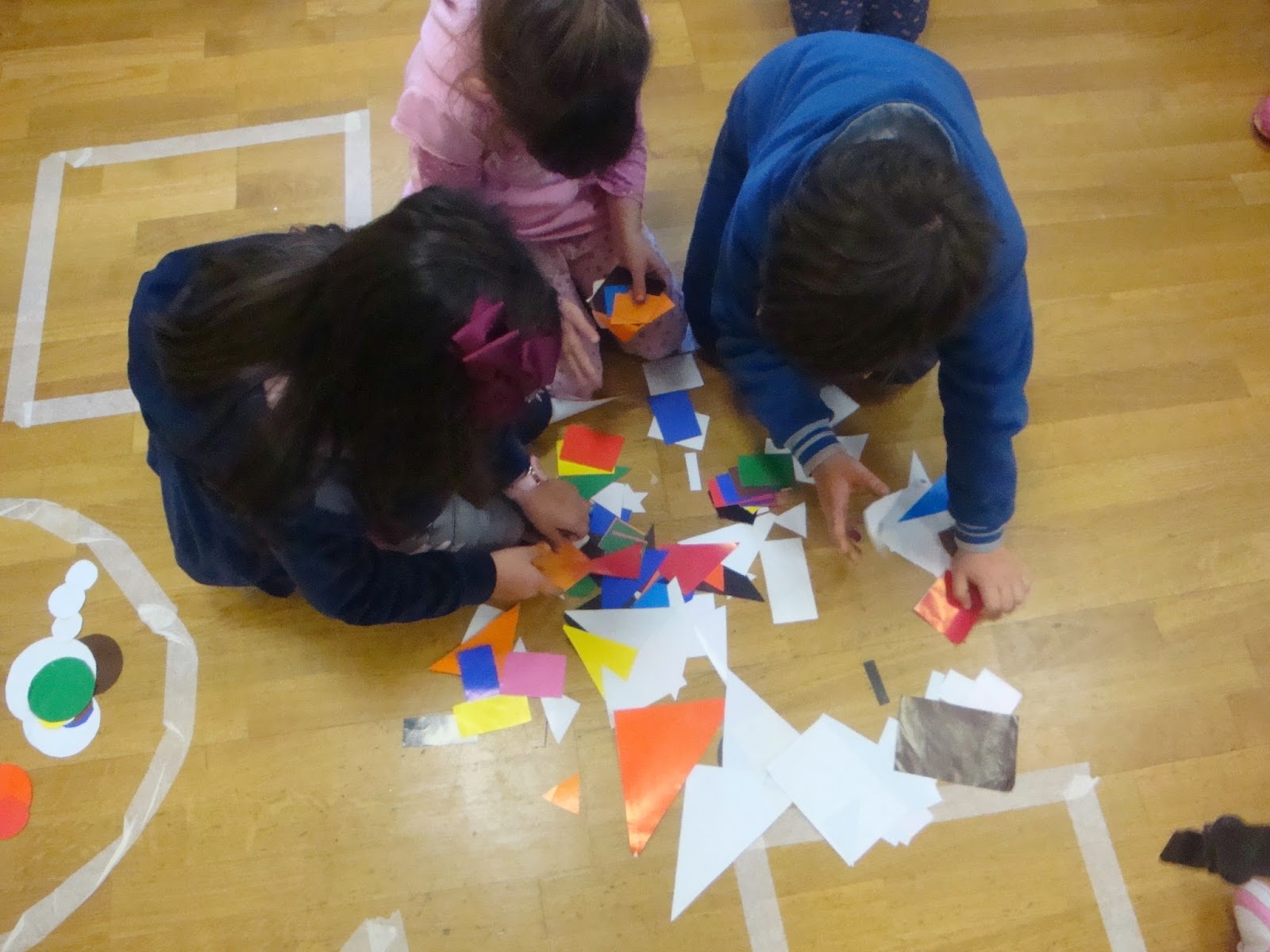 Έπειτα χωριστήκαμε σε 4 ομάδες, ανάλογα με το σχήμα που σχεδιάσαμε στο χεράκι κάθε παιδιού. Η κάθε ομάδα εντόπισε στο χώρο αντικείμενα που έχουν το αντίστοιχο σχήμα και τα ανακοίνωσε στις υπόλοιπες ομάδες. Σκορπίσαμε πολλά γεωμετρικά σχήματα στο πάτωμα και κάθε ομάδα μάζεψε τα δικά της…