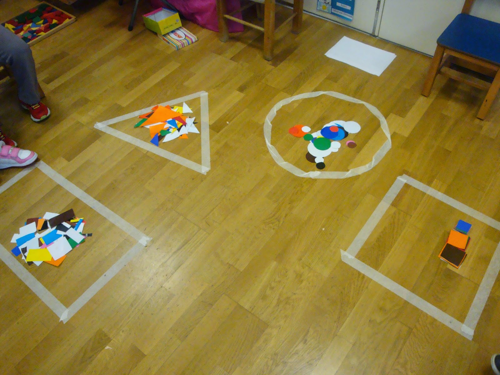 Έπειτα χωριστήκαμε σε 4 ομάδες, ανάλογα με το σχήμα που σχεδιάσαμε στο χεράκι κάθε παιδιού. Η κάθε ομάδα εντόπισε στο χώρο αντικείμενα που έχουν το αντίστοιχο σχήμα και τα ανακοίνωσε στις υπόλοιπες ομάδες. Σκορπίσαμε πολλά γεωμετρικά σχήματα στο πάτωμα και κάθε ομάδα μάζεψε τα δικά της…