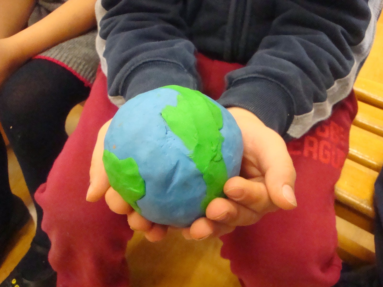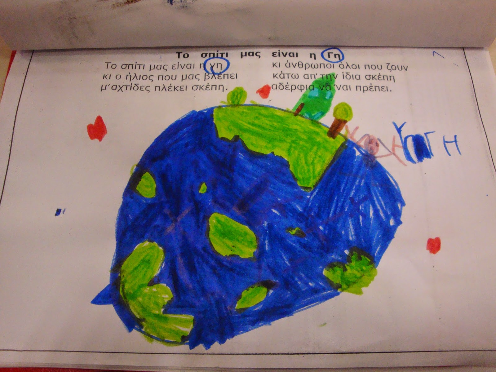 Το σπίτι μας είναι η γη…..ας το γνωρίσουμε λοιπόν. Παρατηρούμε την υδρόγειο σφαίρα. Εντοπίζουμε τη στεριά και τη θάλασσα και τονίζουμε ότι το μεγαλύτερο μέρος της γης καλύπτεται από νερό γι’ αυτό και ονομάζεται γαλάζιος πλανήτης. Παρακολουθούμε ενδιαφέροντα ντοκυμαντέρ σχετικά με τη μορφολογία της γης και τη ζωή πάνω της. Παίζουμε το παιχνίδι ρόλων “όταν κοιτώ τη γη από ψηλά”. Με εργαλείο ένα μαγικό τηλεσκόπιο εξερευνούμε αυτό το μοναδικό πλανήτη και ανακαλύπτουμε όλα εκείνα τα εκπληκτικά στοιχεία που τον συνθέτουν ενώ ταυτόχρονα τα υπόλοιπα παιδιά τα ζωντανεύουν με έναν εκπληκτικό και ευφάνταστο τρόπο. Συνεχίζουμε μαθαίνοντας το ποίημα “το σπίτι μας είναι η γη” και συμπληρώνουμε αντίστοιχο φύλλο εργασίας.