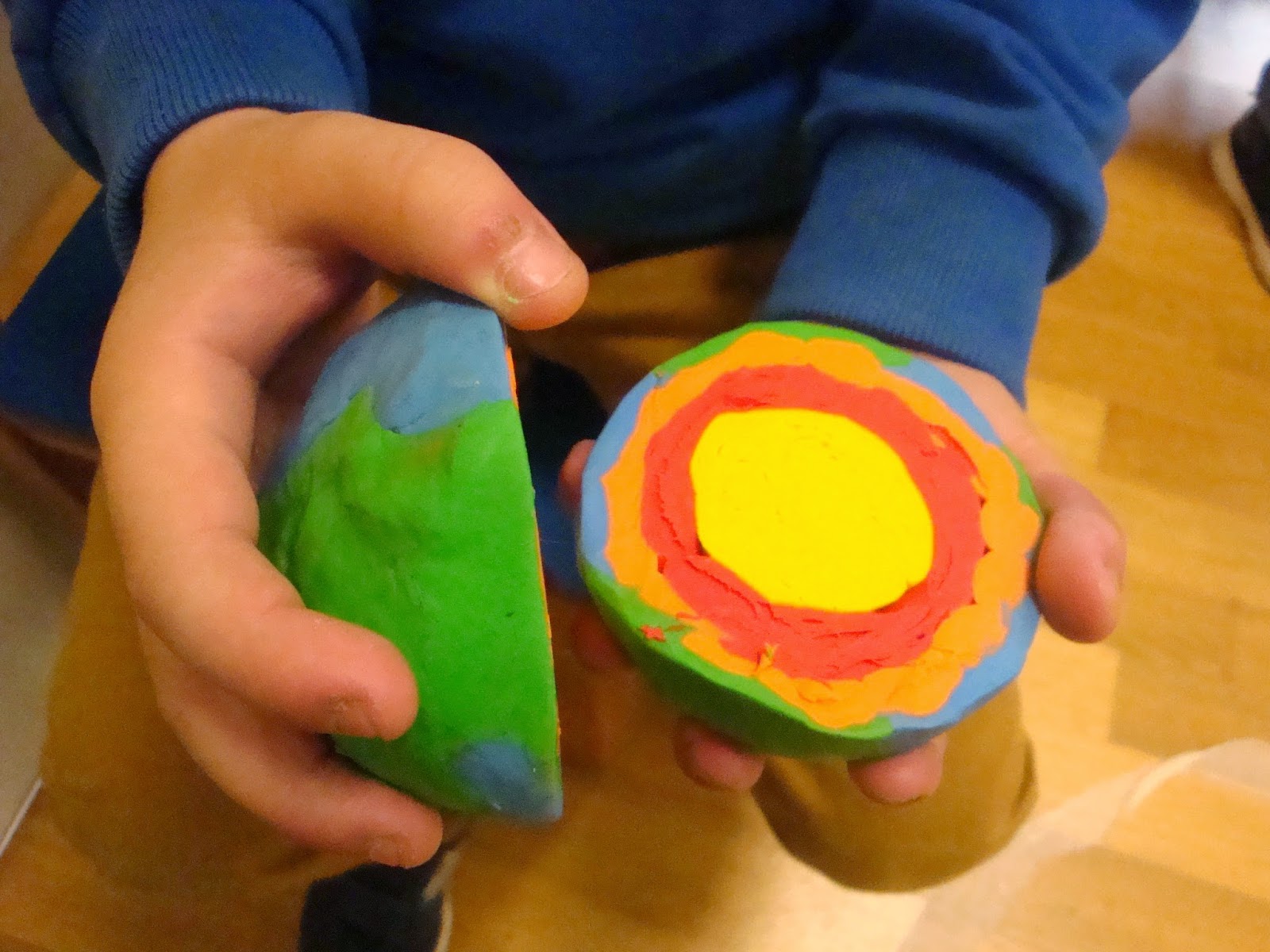 Σειρά έχει να εξερευνήσουμε το εσωτερικό της. Παρατηρούμε εικόνες και ανακαλύπτουμε τον πυρήνα , τον μανδύα και τον φλοιό. Για να κατανοήσουμε καλύτερα το εσωτερικό της γης τη φτιάχνουμε με πλαστελίνη, χτίζοντας σταδιακά τα παραπάνω στρώματα με τα αντίστοιχα χρώματα……