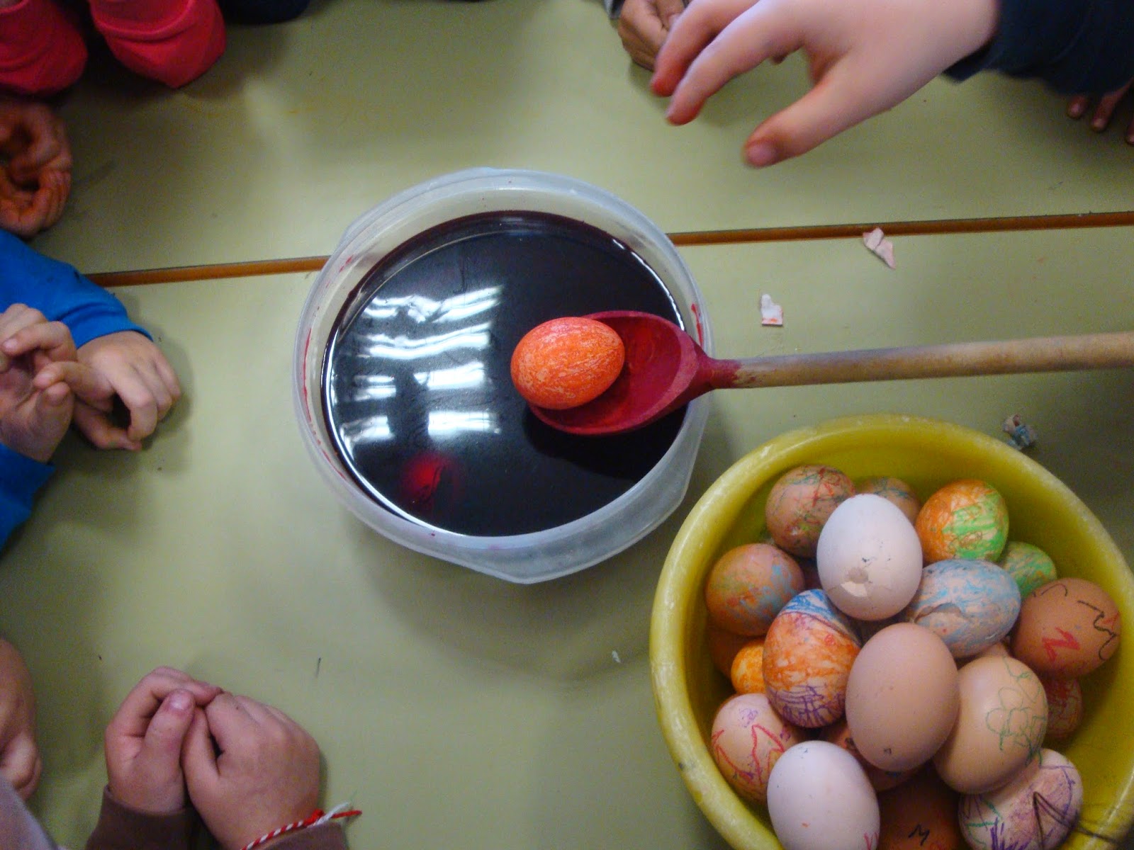 Ας βάψουμε λοιπόν και τα αυγά μας, αφού πρώτα τα διακοσμήσουμε με σχέδια με λαδοπαστέλ. Παίξαμε και το κυνήγι του χαμένου αυγού με σοκολατένια αυγουλάκια που μας έφερε ο σύλλογος γονέων. Νικητές η Άρτεμις και ο Μιχάλης που βρήκαν το αυγό με το τελευταίο ποδαράκι της Κυράς-Σαρακοστής!!!