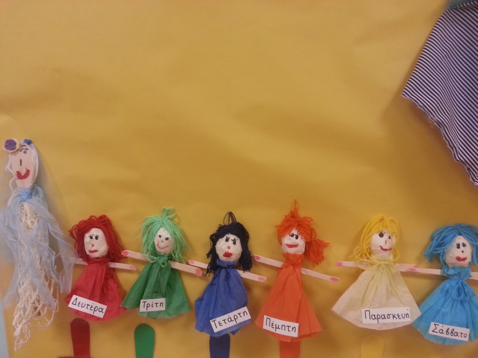 Σειρά είχε η οργάνωση του ημερολογίου της τάξης. Η κυρά βδομάδα μας παρουσίασε τα εφτά της παιδάκια και μεις της τραγουδήσαμε το τραγούδι της από τo cd “Λάχανα- Χάχανα”