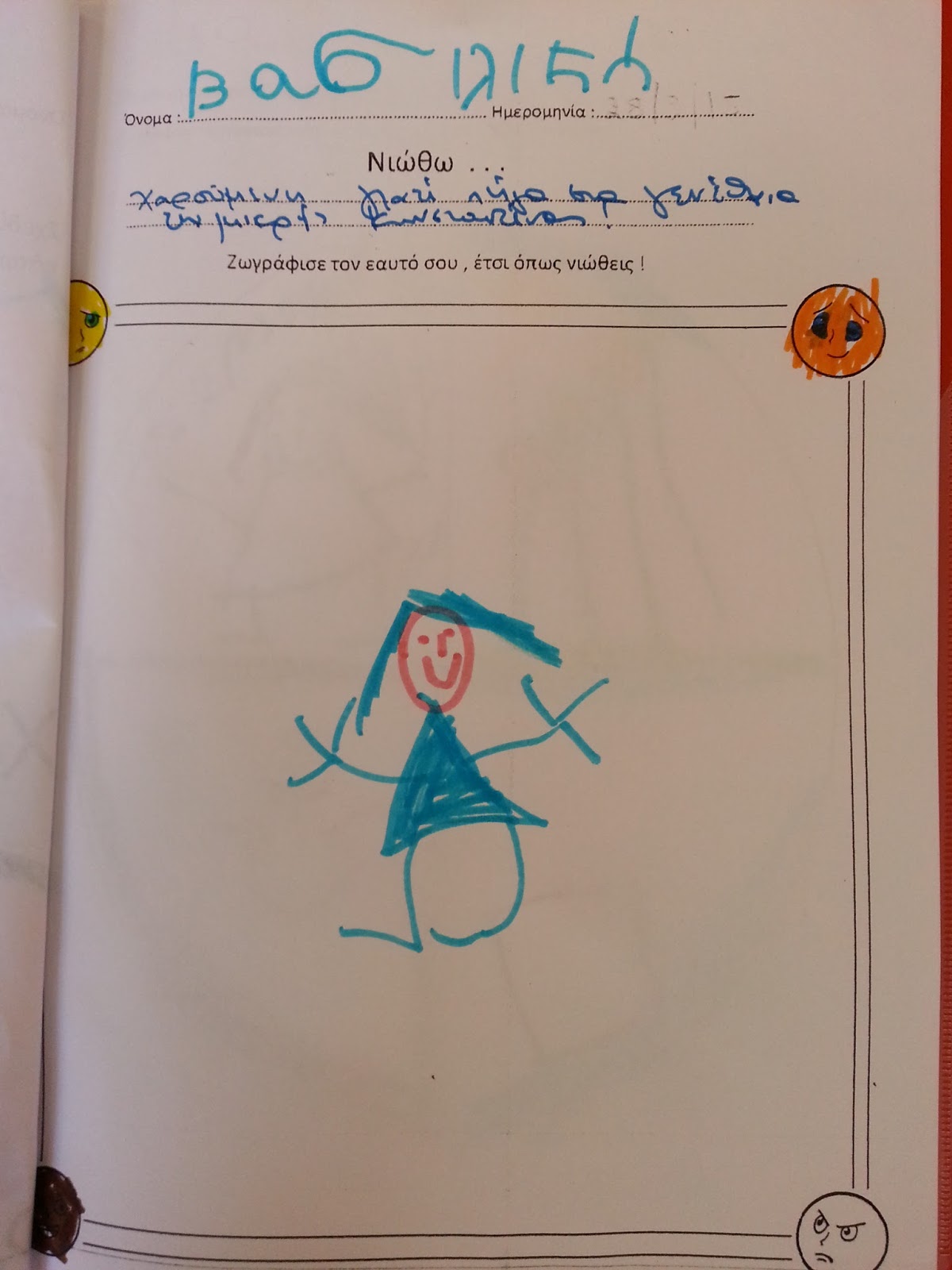 Διαβάζουμε το παραμύθι “αυτό που νιώθω”, και χωριζόμαστε σε ομάδες ανάλογα με το συναίσθημα που επιλέγουμε. Κάθε ομάδα δημιουργεί πορτρέτα-συναισθήματα και γράφει την αντίστοιχη λέξη.