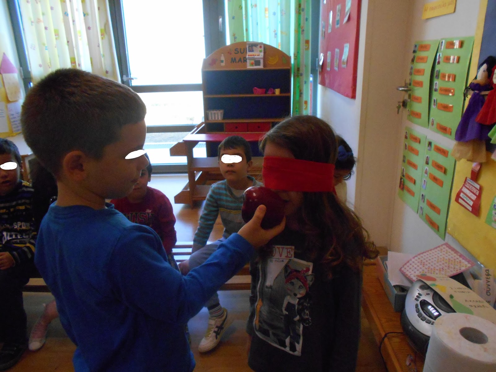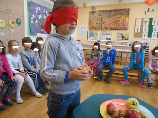Παίξαμε πολλά παιχνίδια προσπαθώντας να μαντέψουμε ποιο φρούτο είναι με τη βοήθεια των αισθήσεων της γεύσης, της όσφρησης και της αφής.