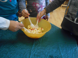 Τέλος, συζητήσαμε για τη διατροφική αξία των φρούτων, φτιάξαμε και φάγαμε φρουτοσαλάτα (που έγινε ανάρπαστη) και καταλήξαμε και εμείς με τη σειρά μας στο συμπέρασμα ” ένα μήλο την ημέρα το γιατρό τον κάνει πέρα”.