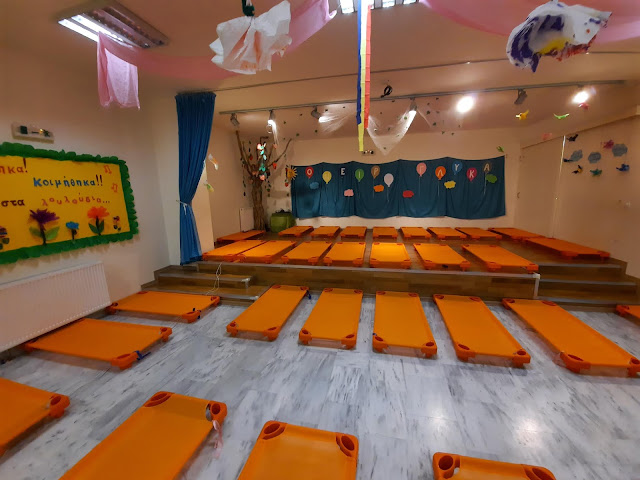 Η σχολική χρονιά προχωρά και θα ήταν παράλειψη μας αν δεν επισημαίναμε τις μικρές αλλά σημαντικές αλλαγές, με τις οποίες ξεκίνησε φέτος το σχολικό έτος. Ας ξεκινήσουμε λοιπόν με μια ιδιαίτερα σημαντική εξέλιξη, σε πρακτικό αλλά και παιδαγωγικό επίπεδο, που αφορά τον εξοπλισμό του Νηπιαγωγείου μας και ειδικότερα της αίθουσας του ύπνου, με ατομικά στοιβαζόμενα κρεβατάκια!!! Τα κρεβατάκια αγοράστηκαν με επιχορήγηση από την πρωτοβάθμια σχολική επιτροπή του Δήμου Ηρακλείου. Ευχαριστούμε τον πρόεδρο της Σχολικής επιτροπής κύριο Περισυνάκη που μας επέτρεψε να υλοποιήσουμε μια βασική ανάγκη του σχολείου μας και έτσι να προσφέρουμε στα παιδιά την άνεση που παρέχει ένας τέτοιος εξοπλισμός, αλλά και να μπορούμε να τηρούμε καλύτερα τους κανόνες υγιεινής. Παράλληλα με την αισθητική παρέμβαση των εκπαιδευτικών του ολοήμερου της κυρίας Ρίτσας και της κυρίας Άννας, οι μαθητές μας φέτος θα χαλαρώνουν σε μια παραμυθένια αίθουσα ύπνου!!!