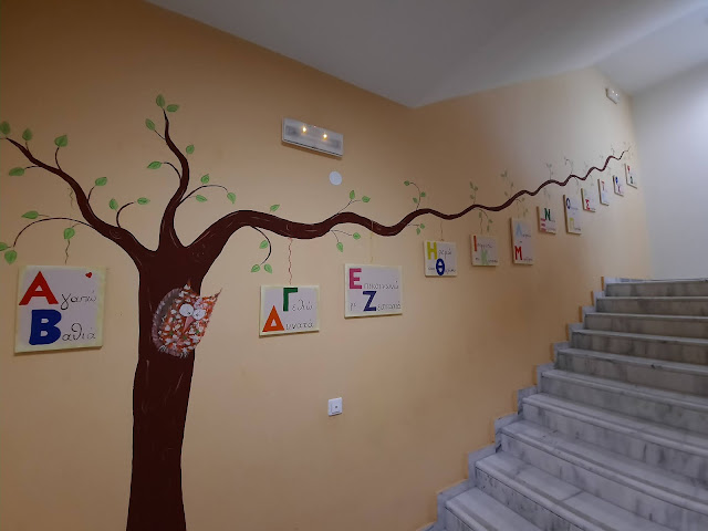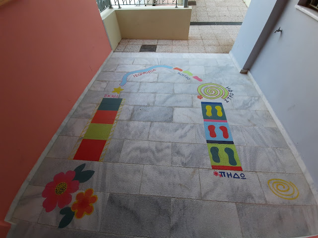 Επίσης θα θέλαμε να ευχαριστήσουμε την αγαπημένη μας εικαστικό και μέλος του συλλόγου γονέων τα προηγούμενα έτη, Κατερίνα Σφακιανάκη που μας βοήθησε να υλοποιήσουμε δύο νέες εικαστικές παρεμβάσεις στον χώρο μας με παιδαγωγική και αισθητική διάσταση. Πρόκειται για το Δέντρο με το “Αλφαβητάρι της Ζωής” που διακόσμησε έναν εσωτερικό τοίχο του σχολείου μας, έργο που υλοποιήθηκε λίγο πριν το κλείσιμο της προηγούμενης σχολικής χρονιάς, με τη συνδρομή και της περσινής Νηπιαγωγού του ολοήμερου τμήματος κυρίας Χρυσούλας. Παράλληλα με την έναρξη του φετινού σχολικού έτους δημιουργήθηκε ένα νέο επιδαπέδιο παιχνίδι, το οποίο σχεδιάστηκε από την Κατερίνα και βάφτηκε από τη κυρία Κυριακή, στην είσοδο του ισογείου έτσι ώστε να μπορεί να αξιοποιείται δημιουργικά και αυτός ο χώρος για το διάλειμμα των παιδιών, μιας και οι συνθήκες απαιτούν μη ανάμιξη των τμημάτων!!!