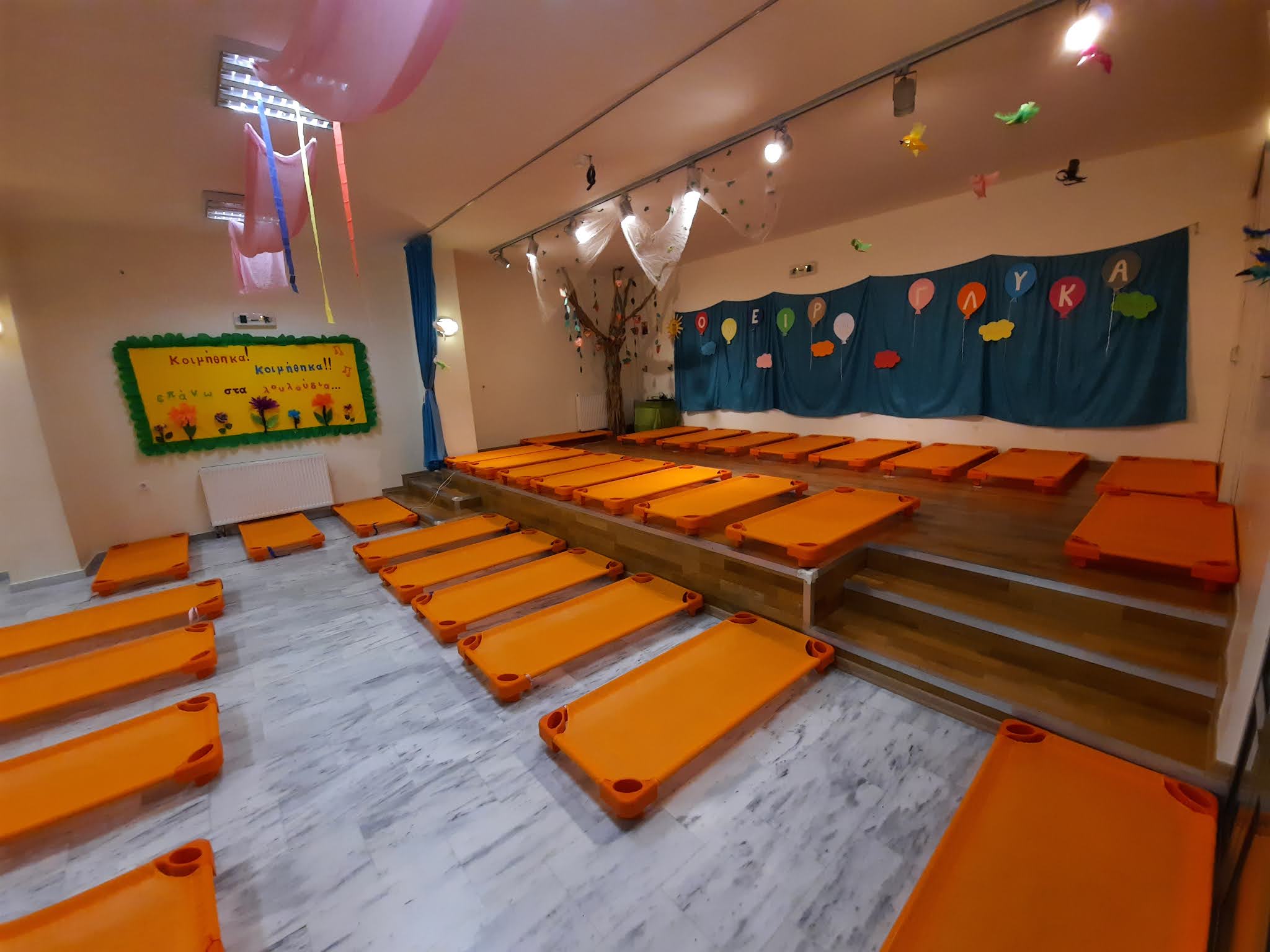 Η σχολική χρονιά προχωρά και θα ήταν παράλειψη μας αν δεν επισημαίναμε τις μικρές αλλά σημαντικές αλλαγές, με τις οποίες ξεκίνησε φέτος το σχολικό έτος. Ας ξεκινήσουμε λοιπόν με μια ιδιαίτερα σημαντική εξέλιξη, σε πρακτικό αλλά και παιδαγωγικό επίπεδο, που αφορά τον εξοπλισμό του Νηπιαγωγείου μας και ειδικότερα της αίθουσας του ύπνου, με ατομικά στοιβαζόμενα κρεβατάκια!!! Τα κρεβατάκια αγοράστηκαν με επιχορήγηση από την πρωτοβάθμια σχολική επιτροπή του Δήμου Ηρακλείου. Ευχαριστούμε τον πρόεδρο της Σχολικής επιτροπής κύριο Περισυνάκη που μας επέτρεψε να υλοποιήσουμε μια βασική ανάγκη του σχολείου μας και έτσι να προσφέρουμε στα παιδιά την άνεση που παρέχει ένας τέτοιος εξοπλισμός, αλλά και να μπορούμε να τηρούμε καλύτερα τους κανόνες υγιεινής. Παράλληλα με την αισθητική παρέμβαση των εκπαιδευτικών του ολοήμερου της κυρίας Ρίτσας και της κυρίας Άννας, οι μαθητές μας φέτος θα χαλαρώνουν σε μια παραμυθένια αίθουσα ύπνου!!!