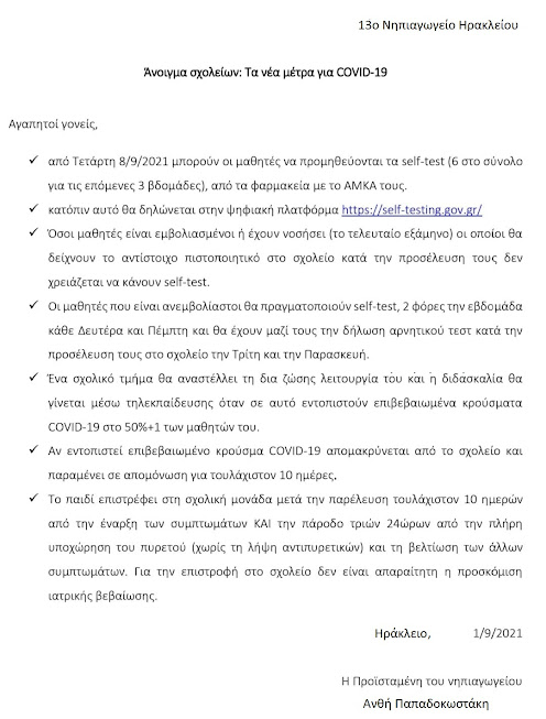 Κατ΄εξαίρεση την πρώτη εβδομάδα του διδακτικού έτους, το τεστ πρέπει να πραγματοποιηθεί έως και 24 ώρες πριν από την προσέλευση στο σχολείο τη Δευτέρα 13/9.