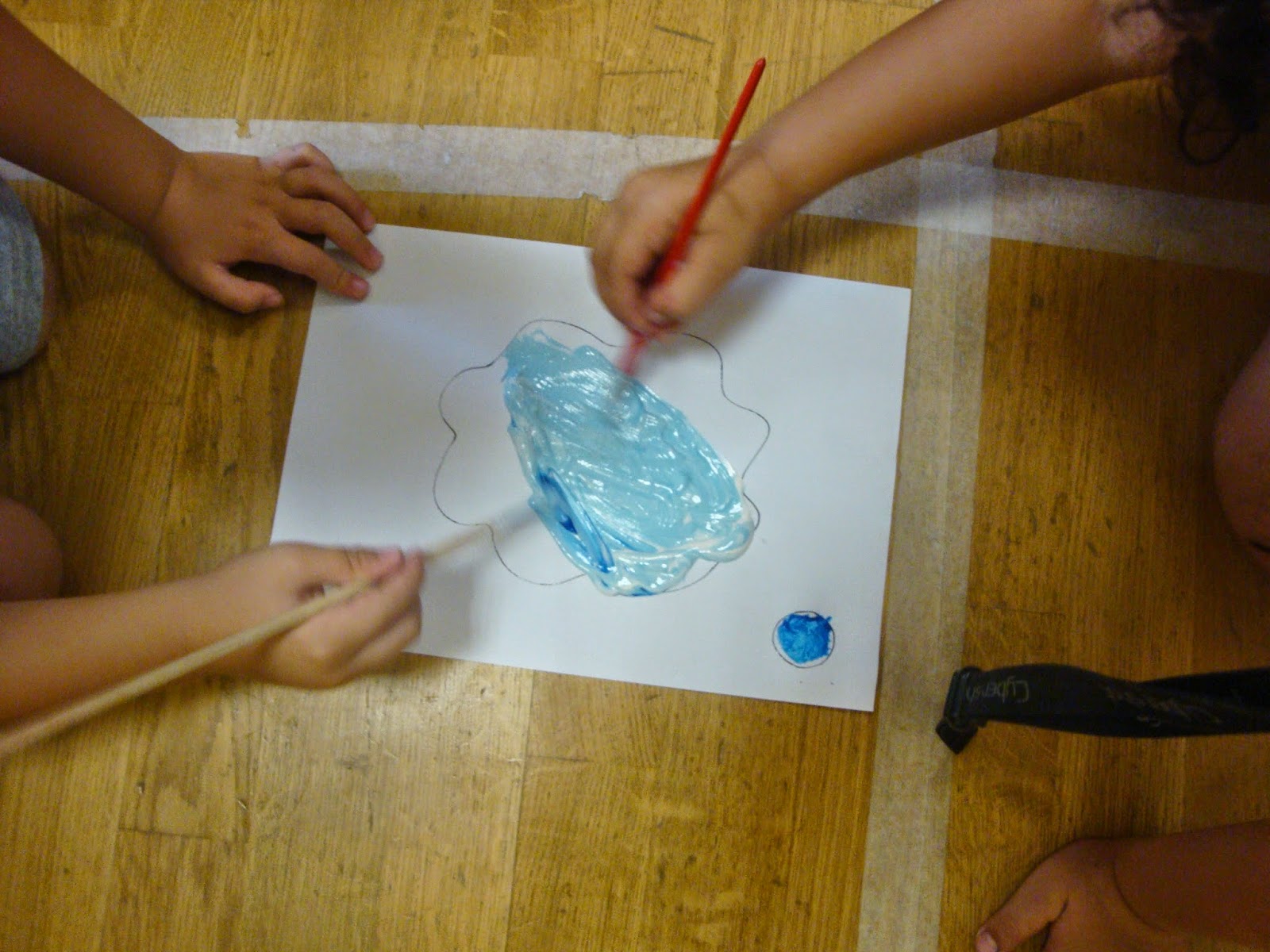 Τα παιδιά κρατούν κορδέλες από γκοφρέ σε διάφορα χρώματα και με τη συνοδεία μουσικής, εκτελούν διάφορες εντολές.Έπειτα χωρίζονται σε πέντε ομάδες, με βάση το χρώμα και χρησιμοποιώντας και άλλα υλικά όπως δακτυλομπογιές, λαδοπαστέλ, ξυλομπογιές δημιουργούν τις παρακάτω εκπληκτικές χρωματοχώρες!!