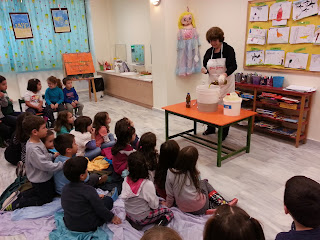 Κάνουμε πειράματα με λάδι και νερό, λάδι και ξύδι και παρατηρούμε ότι πάντα το λάδι βγαίνει από πάνω! Τραγουδάμε το “ντίλι-ντίλι” κι εξασκούμε τη μνήμη μας όταν θυμόμαστε τη σειρά των πραγμάτων και των ζώων που περιλαμβάνει το τραγούδι.