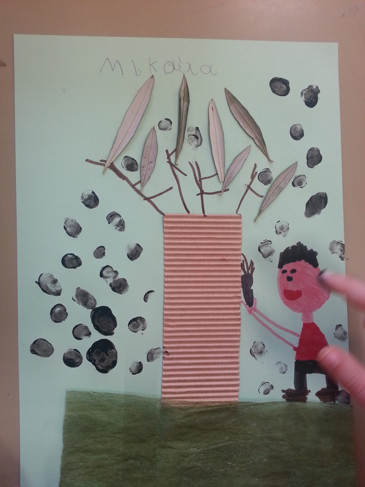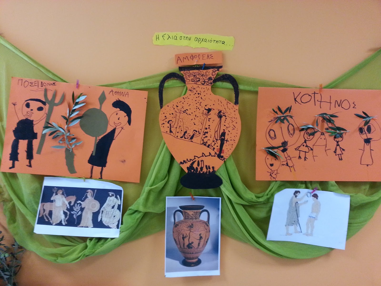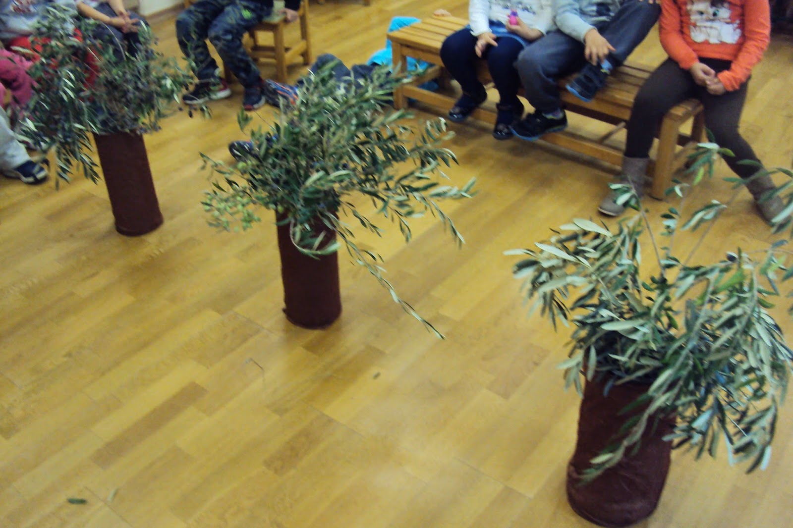 Παρατηρούμε αρχαία αγγεία με απεικονίσεις από το λιομάζωμα και δημιουργούμε τα δικά μας αντίγραφα. Φτιάχνουμε καδράκια με φύλλα ελιάς και γράφουμε τη λέξη “ελιά”. Κατασκευάζουμε το δέντρο της ελιάς με ρολά από χαρτί κουζίνας, χαρτόνια σε σχήμα κύκλου και φύλλα ελιάς.