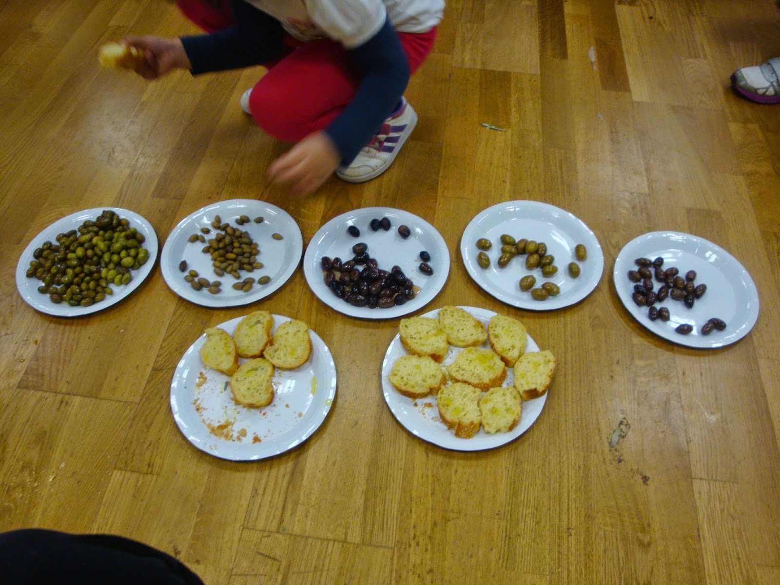 Παρατηρούμε κλαδιά ελιάς, από τι αποτελούνται, τα φύλλα, τις ελιές και περιγράφουμε το σχήμα και το χρώμα τους. Μυρίζουμε το λάδι, το γευόμαστε, το ίδιο και τις επιτραπέζιες ελιές