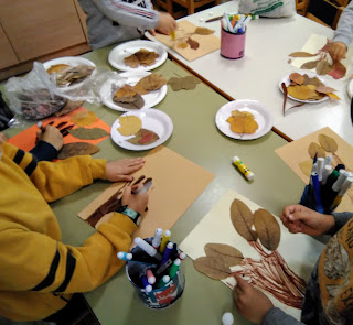 Μαζέψαμε φύλλα φθινοπωρινά, τα παρατηρήσαμε, τα αγγίξαμε, τα θρυμματίσαμε και τέλος τα χρησιμοποιήσαμε για να δημιουργήσουμε μια φθινοπωρινή εικόνα.