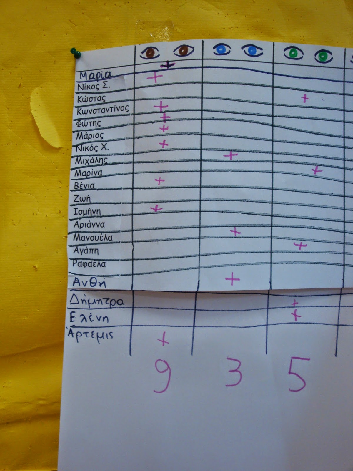 Τραγουδάμε και συνοδεύουμε με κινήσεις πολλά γνωστά τραγούδια για το σώμα όπως το “χαρωπά”, το “χόκυ πόκυ”, “που είναι ο αντίχειρας”, “κεφάλι, ώμοι”. Τονίζουμε ότι παρά τις ομοιότητες που έχουμε είμαστε και διαφορετικοί. Για να το διαπιστώσουμε δημιουργούμε έναν πίνακα διπλής εισόδου με το χρώμα των ματιών μας και καταγράφουμε τα αποτελέσματα. Παίζουμε το παιχνίδι”μάντεψε ποιον έχω βάλει στο μυαλό μου”.