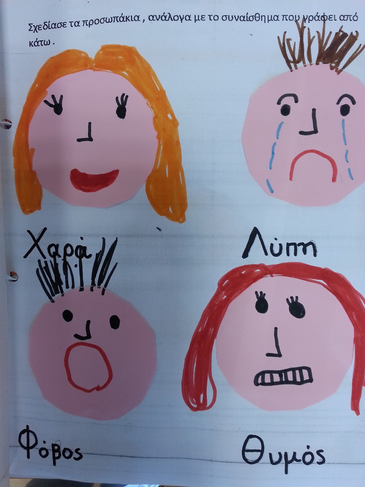 Διαβάζουμε το παραμύθι “αυτό που νιώθω”, και χωριζόμαστε σε ομάδες ανάλογα με το συναίσθημα που επιλέγουμε. Κάθε ομάδα δημιουργεί πορτρέτα-συναισθήματα και γράφει την αντίστοιχη λέξη.