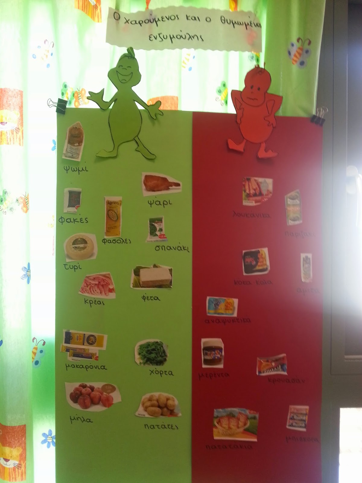Έτσι, όταν στο νηπιαγωγείο μας ήρθαν δυο παράξενες κυρίες, η κυρία ανθυγιεινή και η κυρία υγιεινή τις χορτάσαμε με τις τροφές της προτίμησης τους (κολλώντας πάνω τους εικόνες από τροφές) και τονίσαμε τις συνέπειες από τις διατροφικές τους συνήθειες!!!