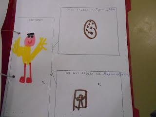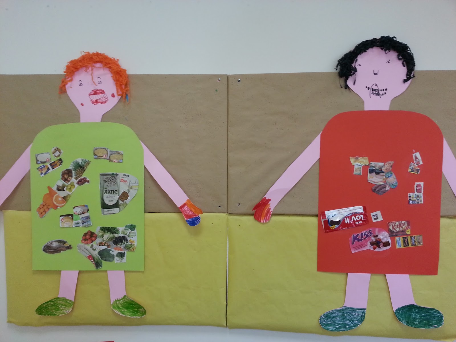 Έτσι, όταν στο νηπιαγωγείο μας ήρθαν δυο παράξενες κυρίες, η κυρία ανθυγιεινή και η κυρία υγιεινή τις χορτάσαμε με τις τροφές της προτίμησης τους (κολλώντας πάνω τους εικόνες από τροφές) και τονίσαμε τις συνέπειες από τις διατροφικές τους συνήθειες!!!