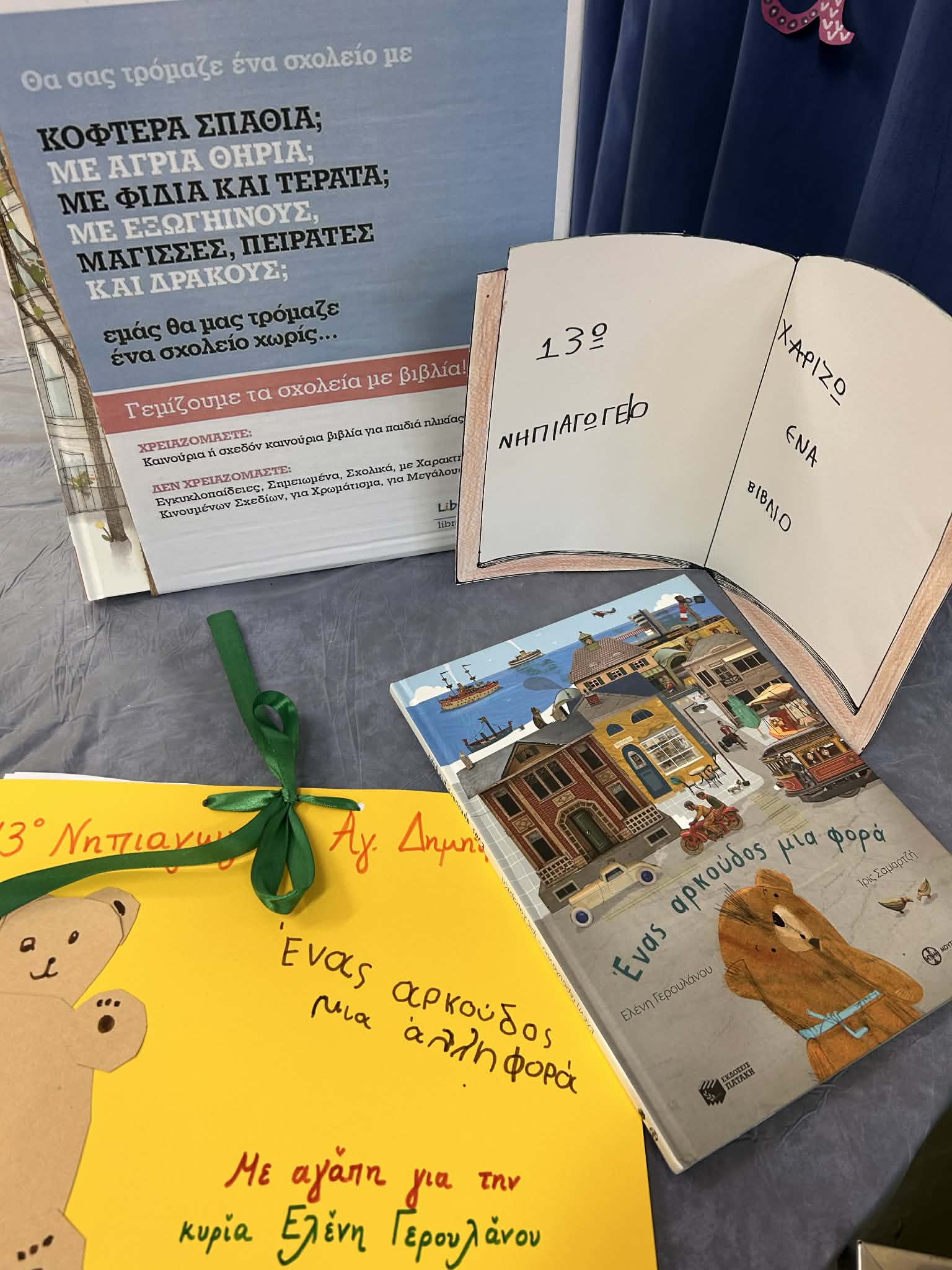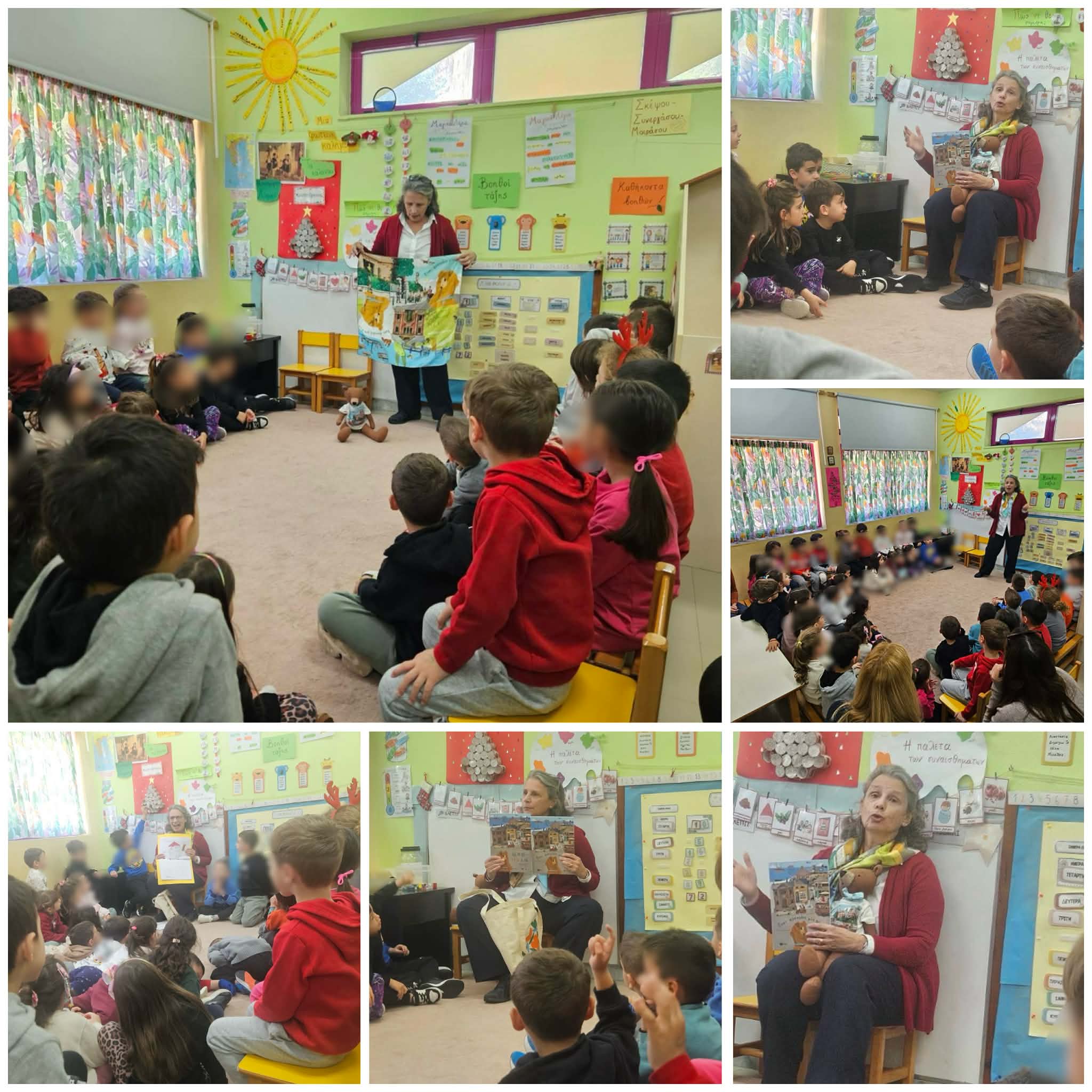 Με ιδιαίτερη χαρά και βαθιά συγκίνηση υποδεχτήκαμε στο νηπιαγωγείο μας την συγγραφέα Ελένη Γερουλάνου, η οποία είναι, παράλληλα, και η ψυχή της μη-κερδοσκοπικής οργάνωσης Library4All, που εργάζεται άοκνα ώστε κάθε παιδί να έχει πρόσβαση στο βιβλίο και στη γνώση. Η επίσκεψή της δεν αποτέλεσε ένα μεμονωμένο γεγονός, αλλά την κορύφωση μιας παιδαγωγικής διαδρομής που είχε ξεκινήσει εβδομάδες πριν. Τα παιδιά μας είχαν ήδη γνωρίσει το έργο της μέσα από την ανάγνωση του βιβλίου της “Ένας αρκούδος μια φορά” (Εκδόσεις Πατάκη) και είχαν προετοιμάσει ερωτήσεις που ήθελαν να της απευθύνουν. Είχαν όμως ετοιμάσει κι ένα δώρο για εκείνη – ο ήρωας του βιβλίου, ο αρκούδος, έγινε αφορμή για να φανταστούν τόπους, διαδρομές και εμπειρίες που θα μπορούσαν να εμπνεύσουν τη συγγραφέα στη δημιουργία ενός νέου βιβλίου! Με ιδιαίτερη φροντίδα και ενθουσιασμό, τα παιδιά προσέφεραν στην Ελένη Γερουλάνου ως δώρο τις ζωγραφιές που αποτύπωναν αυτά τα μέρη και τις ιστορίες που γεννήθηκαν στη φαντασία τους. Κατά τη διάρκεια της επίσκεψης, τα παιδιά παρουσίασαν επίσης τα βιβλία που έχουν συγκεντρώσει μέχρι σήμερα για τον σκοπό του Library4All, καθώς και τις ζωγραφιές που δημιούργησαν για να συνοδεύσουν την προσφορά τους. Μέσα από αυτή τη διαδικασία, η έννοια της προσφοράς, της αλληλεγγύης και της κοινωνικής ευθύνης απέκτησε για τα παιδιά απτό νόημα, ενταγμένο στην καθημερινή εκπαιδευτική εμπειρία. Η συνάντηση αυτή επιβεβαίωσε με τον πιο ουσιαστικό τρόπο ότι η φιλαναγνωσία, όταν καλλιεργείται από νωρίς και συνδέεται με αξίες, μπορεί να γίνει γέφυρα επικοινωνίας, έμπνευσης και κοινωνικής δράσης. Ευχαριστούμε θερμά την κυρία Ελένη Γερουλάνου για την παρουσία, τη ζεστασιά και για τον τρόπο με τον οποίο αγκάλιασε τις σκέψεις και τις δημιουργίες των παιδιών μας. Μπορείτε να δείτε τις ζωγραφιές που χαρίσαμε στην κυρία Γερουλάνου στο σύνδεσμο που ακολουθεί: