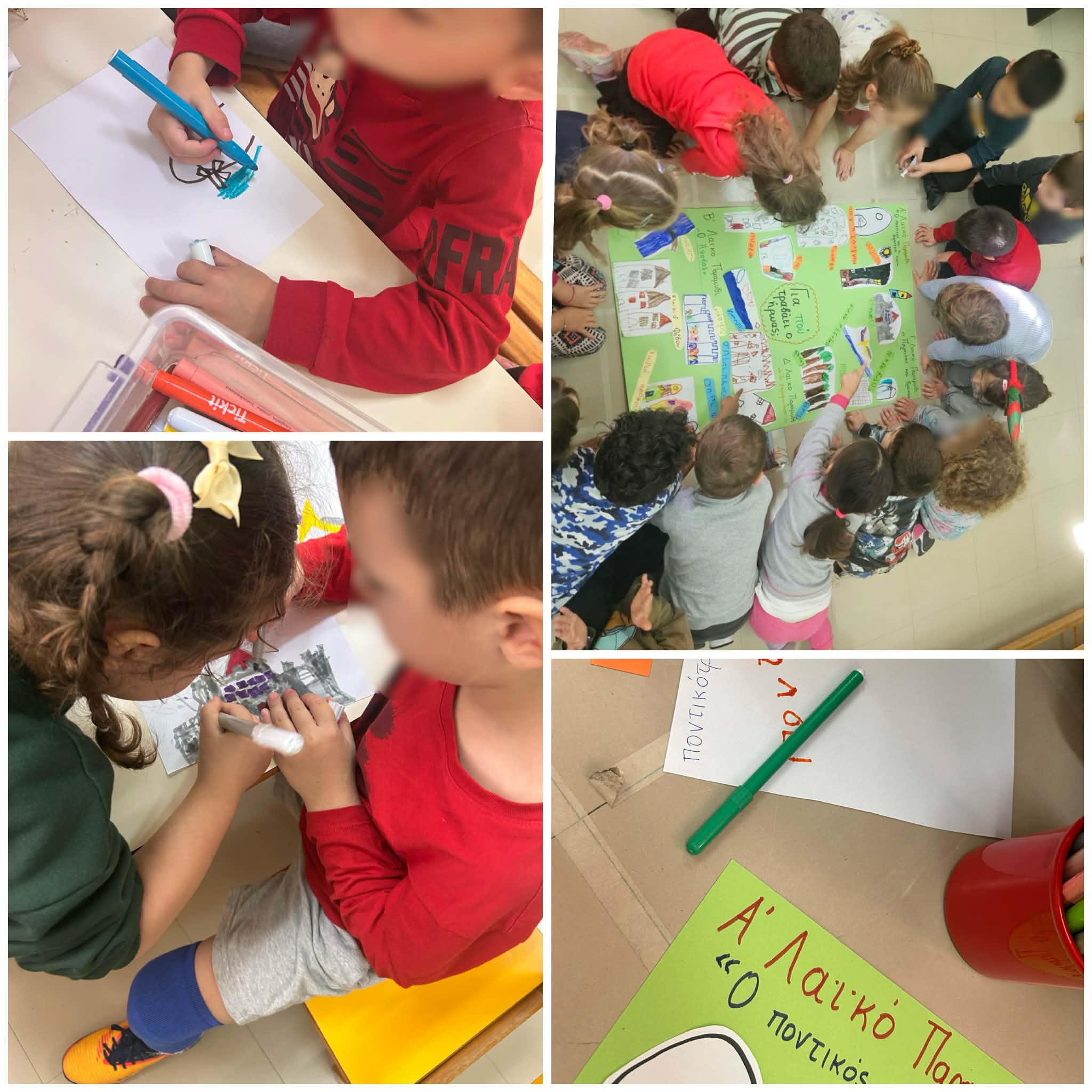 Στο πλαίσιο της ενασχόλησής μας με τα λαϊκά παραμύθια, τα παιδιά κάθε τμήματος εργάστηκαν συστηματικά πάνω στα βασικά αφηγηματικά στοιχεία, αναγνωρίζοντας ήρωες, τόπους δράσης και δομικά χαρακτηριστικά των ιστοριών. Η διαδικασία αυτή αποτέλεσε μια μοναδική ευκαιρία για να καλλιεργηθούν δεξιότητες γλωσσικού γραμματισμού, συνεργατικότητας και δημιουργικής σκέψης, ενώ παράλληλα ενίσχυσε την ικανότητα των παιδιών να αναστοχάζονται πάνω σε αφηγηματικά μοτίβα. Ως προϊόν αυτής της διερεύνησης, κάθε τμήμα δημιούργησε δύο συλλογικές αφίσες: