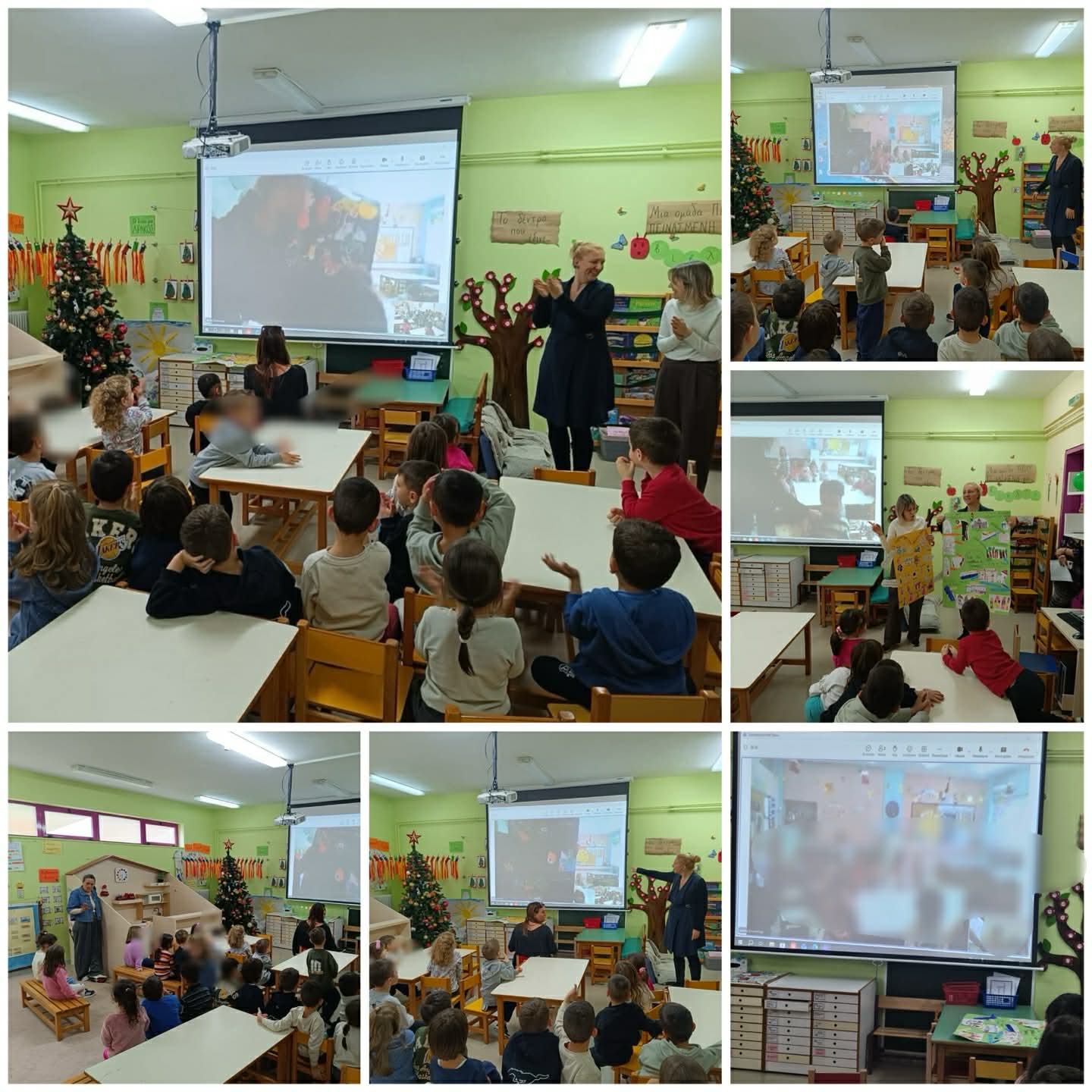 Τα παιδιά είχαν την ευκαιρία να παρουσιάσουν το έργο τους, να μοιραστούν τις αφίσες που δημιούργησαν και να περιγράψουν τη δική τους εμπειρία βιωματικής εξερεύνησης των λαϊκών παραμυθιών στην πρώτη διαδικτυακή συνάντηση που είχαμε με το 7ο Νηπιαγωγείο Αγίου Ιωάννη Ρέντη. Η ανταπόκριση των παιδιών ήταν ιδιαίτερα ενθουσιώδης· παρακολούθησαν με ενδιαφέρον τις παρουσιάσεις των συνομήλικών τους από το συνεργαζόμενο σχολείο, οι οποίοι μας εισήγαγαν στις δικές τους δημιουργίες γύρω από τα παραμύθια. Η αλληλεπίδραση αυτή ενίσχυσε την κοινωνική διάσταση της μάθησης, δίνοντας στα παιδιά την ευκαιρία να εκφραστούν, να επικοινωνήσουν και να αναπτύξουν μια ουσιαστική αίσθηση κοινότητας.