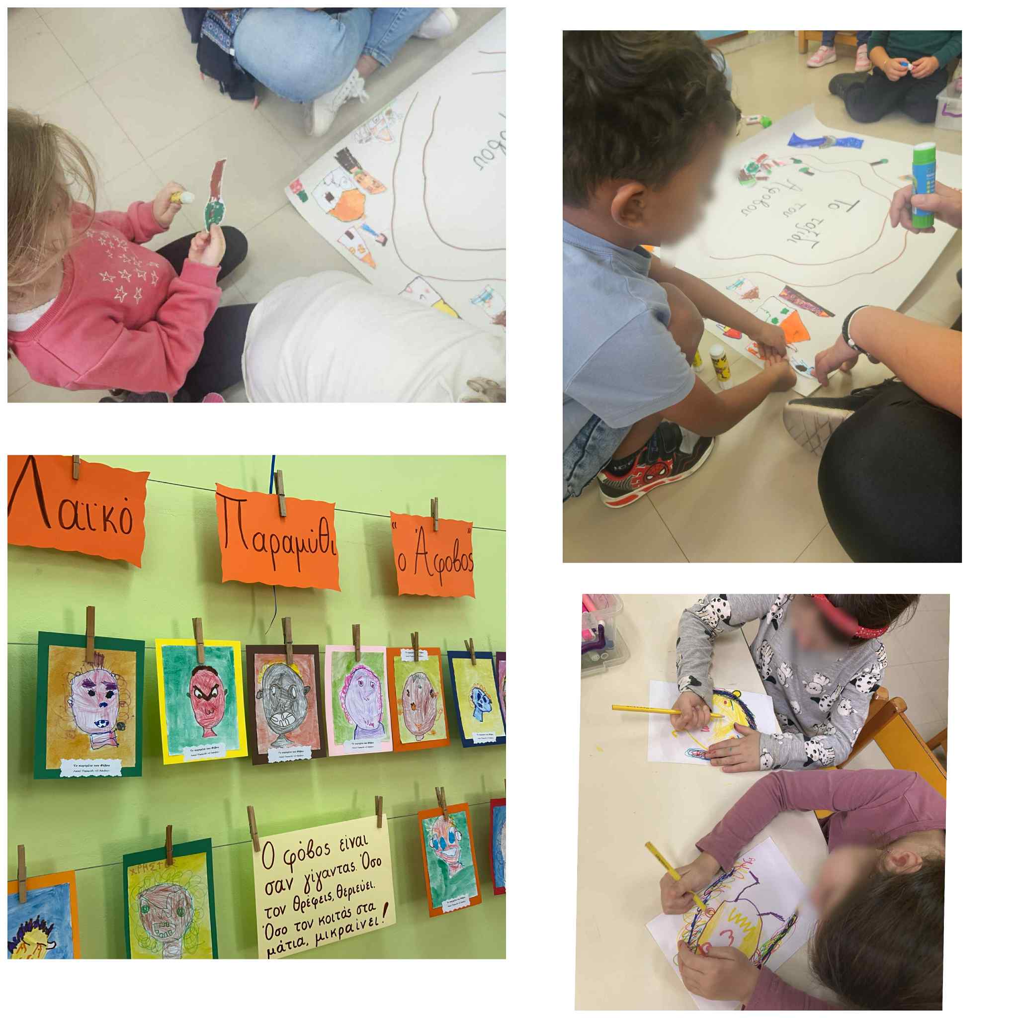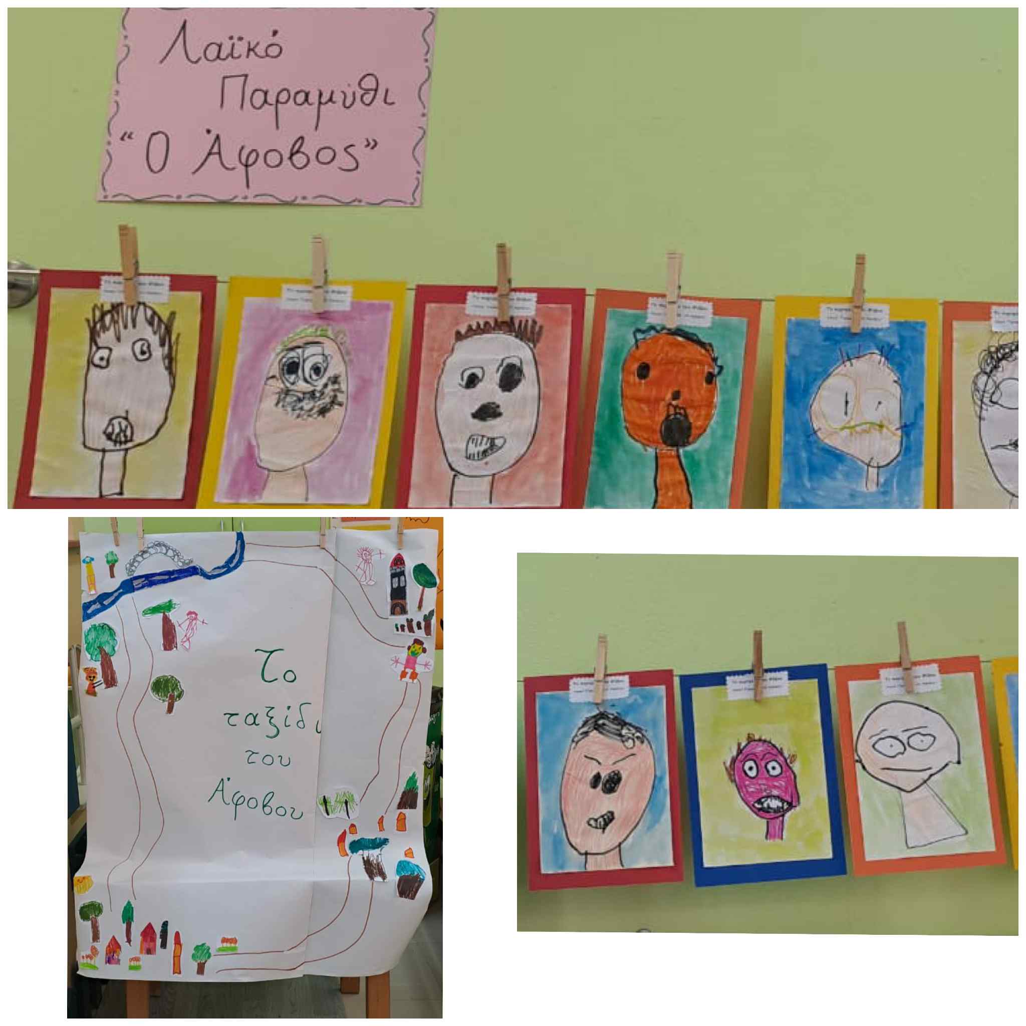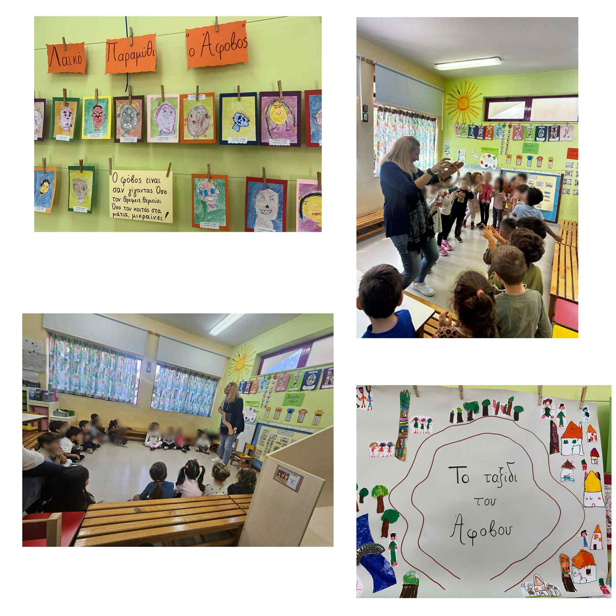Στο πλαίσιο του Σχεδίου Δράσης του σχολείου μας και της προσέγγισης των λαϊκών παραμυθιών, σειρά είχε το λαϊκό παραμύθι «Ο Άφοβος» από την Μικρά Ασία. Μετά την αφήγηση του παραμυθιού, οι μικροί μας μαθητές ανέλαβαν να αναπαραστήσουν το ταξίδι του ήρωα, δημιουργώντας έναν χάρτη με όλα τα μέρη από τα οποία πέρασε ο Άφοβος αναζητώντας τον Φόβο. Μέσα από αυτή τη δραστηριότητα, εξασκήθηκαν στην κατανόηση και ανασύνθεση της αφήγησης, στην αφήγηση με χρονική και λογική ακολουθία, καθώς και στη χρήση λεξιλογίου που σχετίζεται με τόπους, συναισθήματα και δράση. Παράλληλα, η αφήγηση του παραμυθιού λειτούργησε ως αφορμή για έκφραση συναισθημάτων, καλλιέργεια φαντασίας και ενίσχυση της προφορικής επικοινωνίας. Στη συνέχεια, οι μαθητές δημιούργησαν το πορτρέτο του Φόβου, όπως τον φαντάστηκαν μέσα από το παραμύθι. Η εικαστική αυτή δραστηριότητα τους έδωσε την ευκαιρία να μεταφράσουν το αφηρημένο συναίσθημα σε εικόνα χρησιμοποιώντας τη γλώσσα της τέχνης. Η δράση ολοκληρώθηκε με ένα κινητικό – βιωματικό παιχνίδι, εμπνευσμένο από το γνωστό παιχνίδι «Ψάχνω το λιοντάρι». Τα παιδιά ξεκίνησαν μια φανταστική αναζήτηση για τον Φόβο, συναντώντας καθ’ οδόν διάφορες «τρομακτικές» καταστάσεις, τις οποίες όμως αντιμετώπισαν με θάρρος, συνεργασία και χιούμορ. Το αμείωτο ενδιαφέρον των παιδιών για τα λαϊκά παραμύθια ανέδειξε τη διαχρονική τους αξία ως μέσου πολιτισμικής έκφρασης και συναισθηματικής αγωγής. Η συνολική εμπειρία βοήθησε τα παιδιά να κατανοήσουν πως ο φόβος είναι ένα φυσιολογικό συναίσθημα, το οποίο μπορούμε να αναγνωρίσουμε, να εκφράσουμε και τελικά να ξεπεράσουμε. Γιατί, όπως λέει κι ο Άφοβος στο τέλος του παραμυθιού: “Ο φόβος είναι ένας γίγαντας. Όσο τον θρέφεις, θεριεύει. Όσο τον κοιτάς στα μάτια, μικραίνει“.