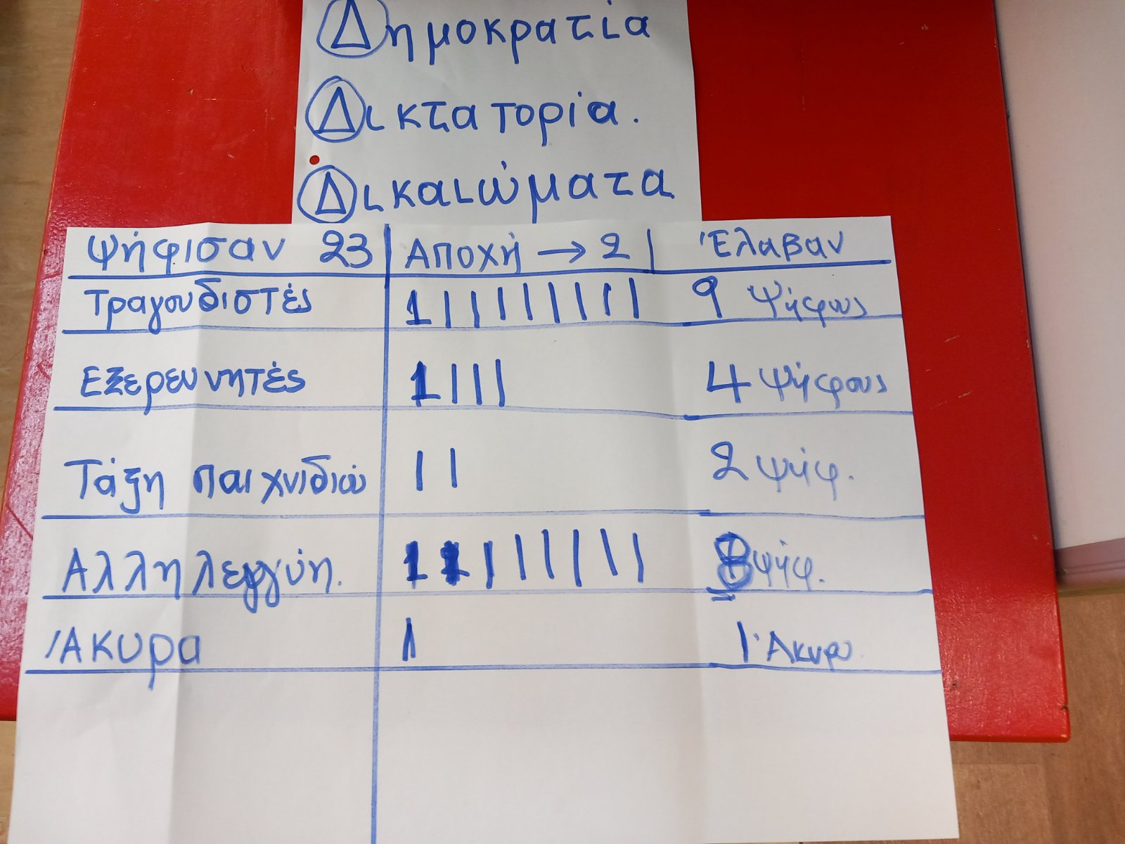 Φτιάξαμε ψηφοδέλτια, κάλπη, ορίσαμε εφορευτική επιτροπή και ψηφίσαμε το όνομα της τάξης. Αποτυπώσαμε τα αποτελέσματα σε ένα μεγάλο χαρτί και η τάξη μας ονομάστηκε ” Τραγουδιστές της αλληλεγγύης”.