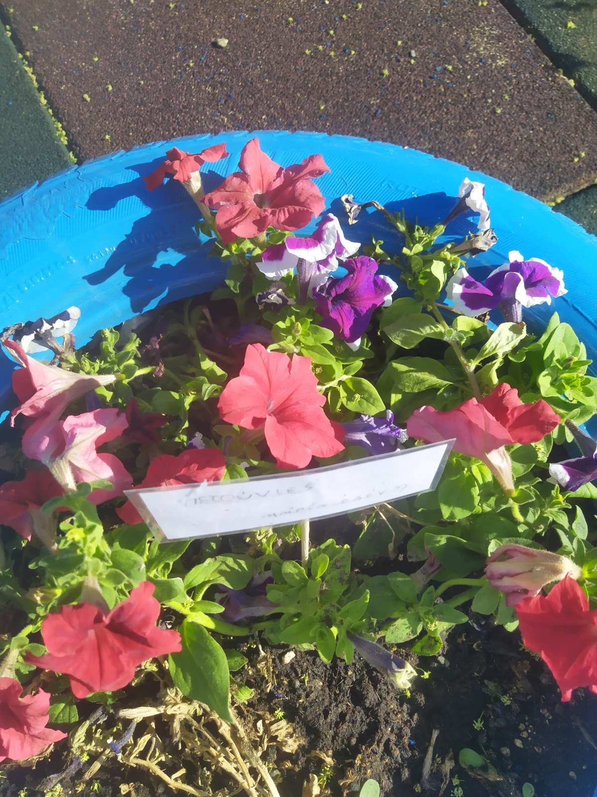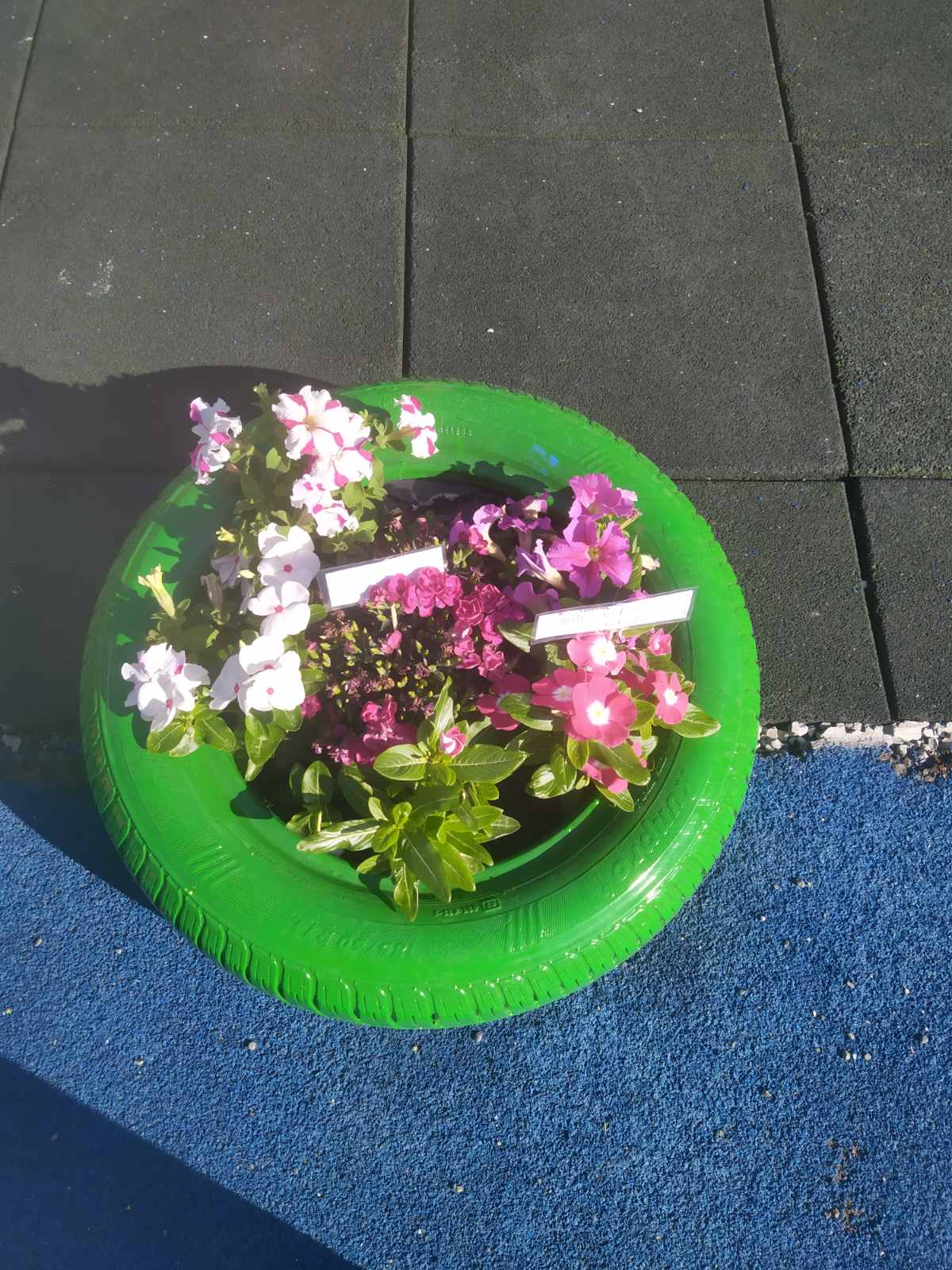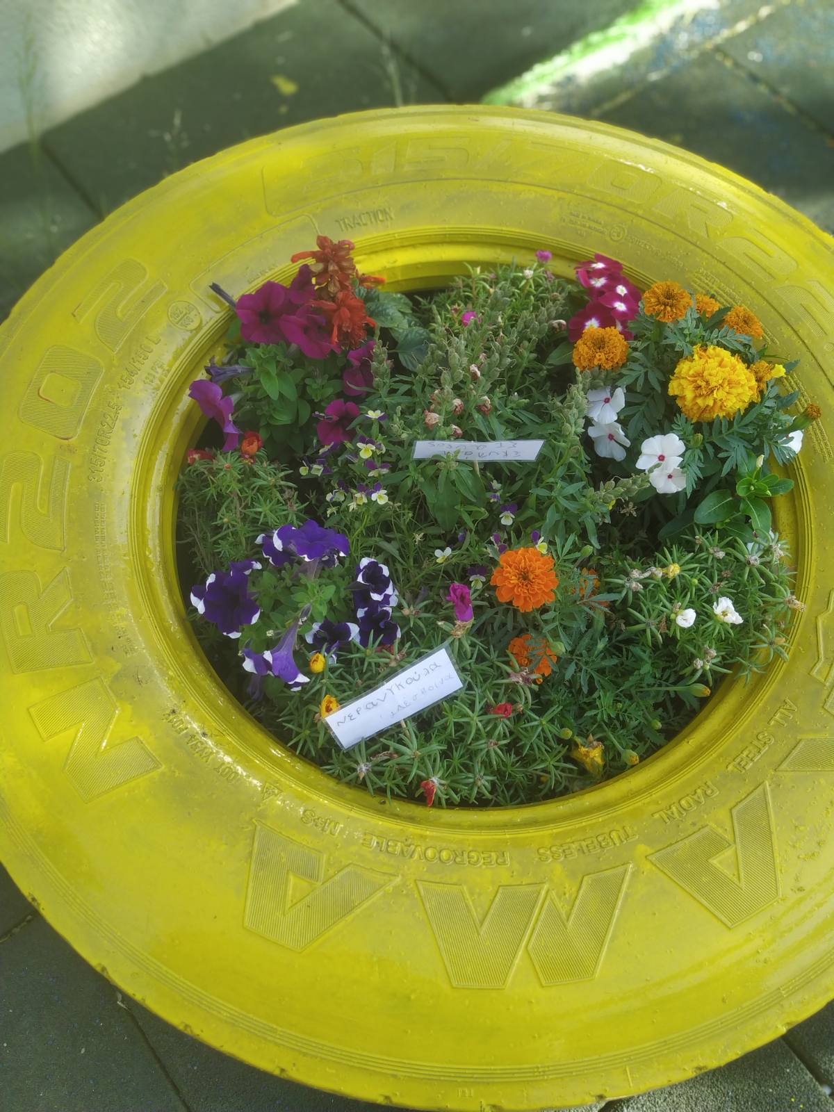 Προμηθευτήκαμε λάστιχα αυτοκινήτων, τα βάψαμε, τα διαμορφώσαμε κατάλληλα σε γλάστρες, τοποθετήσαμε χώμα και φυτέψαμε αρωματικά φυτά και λουλούδια.