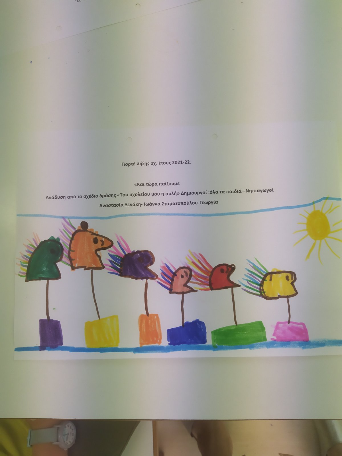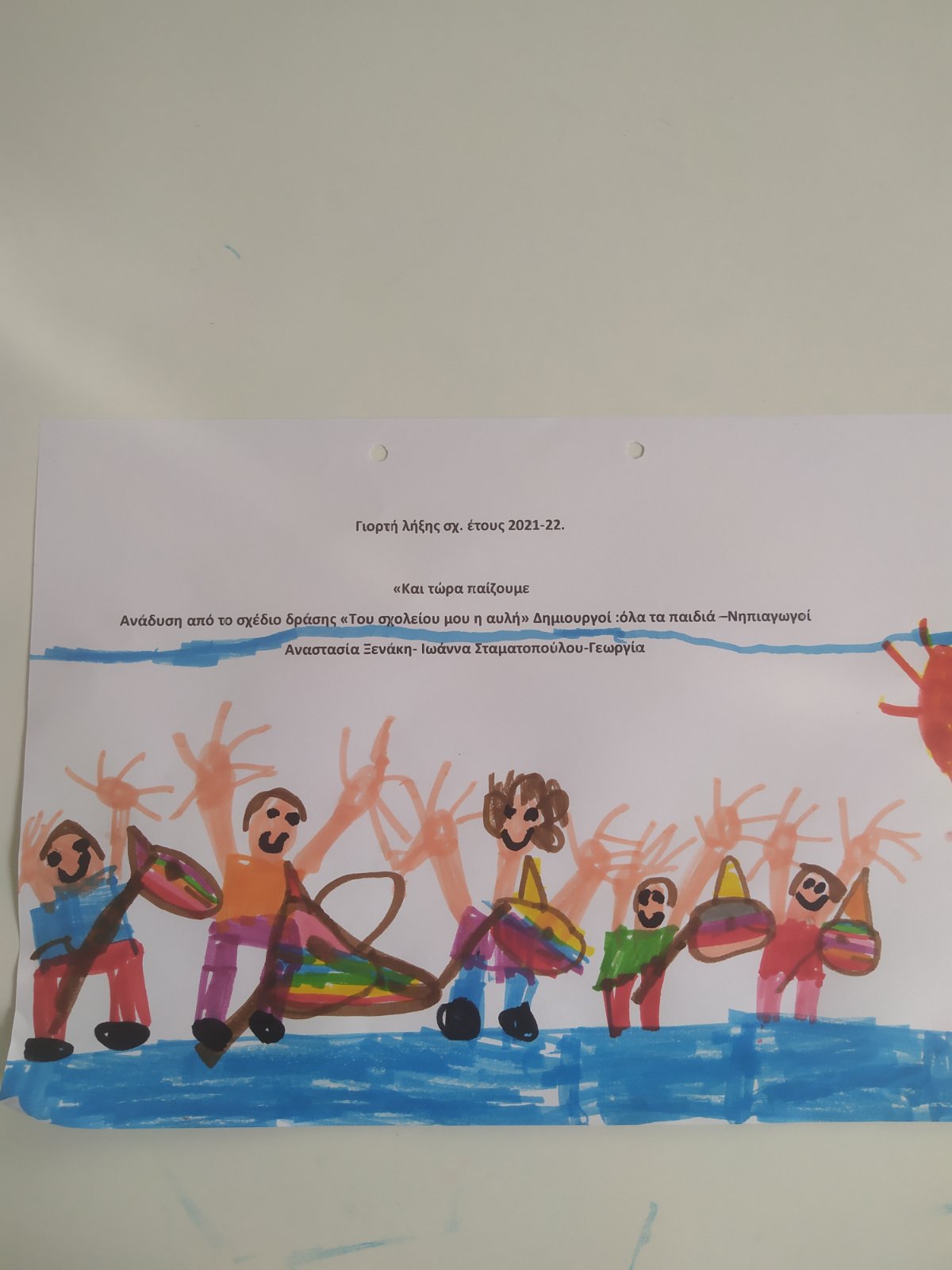 Από το σχέδιο δράσης του τμήματος “Του σχολειού μου η αυλή” αναδύθηκε η γιορτή λήξης “Και τώρα παίζουμε”. Τα παιδιά επέλεξαν να παίξουν στη σκηνή Περνά περνά η μέλισσα, 1-2-3 κόκκινο φως, Κολοκυθιά, Αλάτι χοντρό αλάτι ψιλό και έτσι παρακολουθήσαμε γιορτή φτιαγμένη από παιδιά για παιδιά.