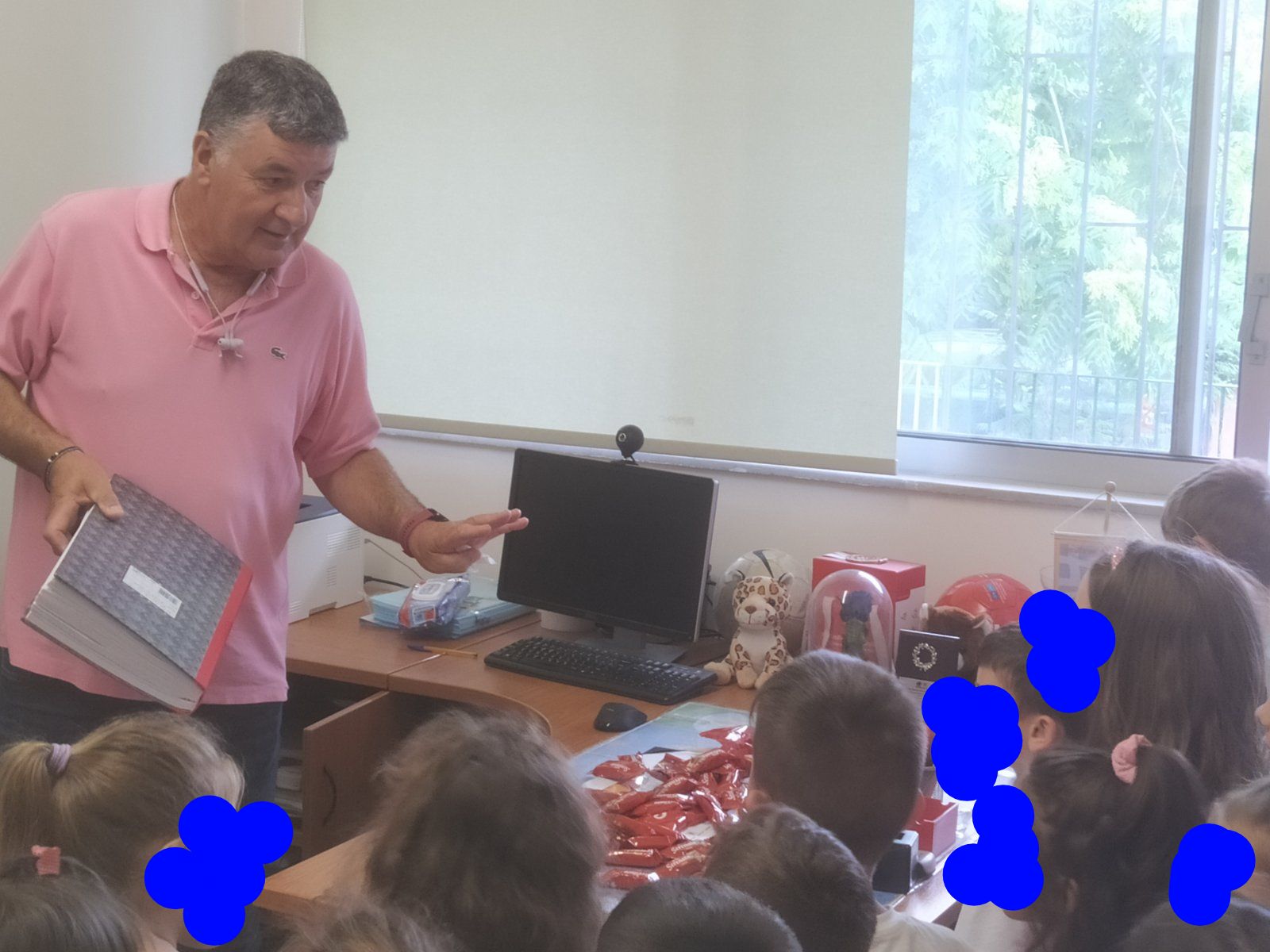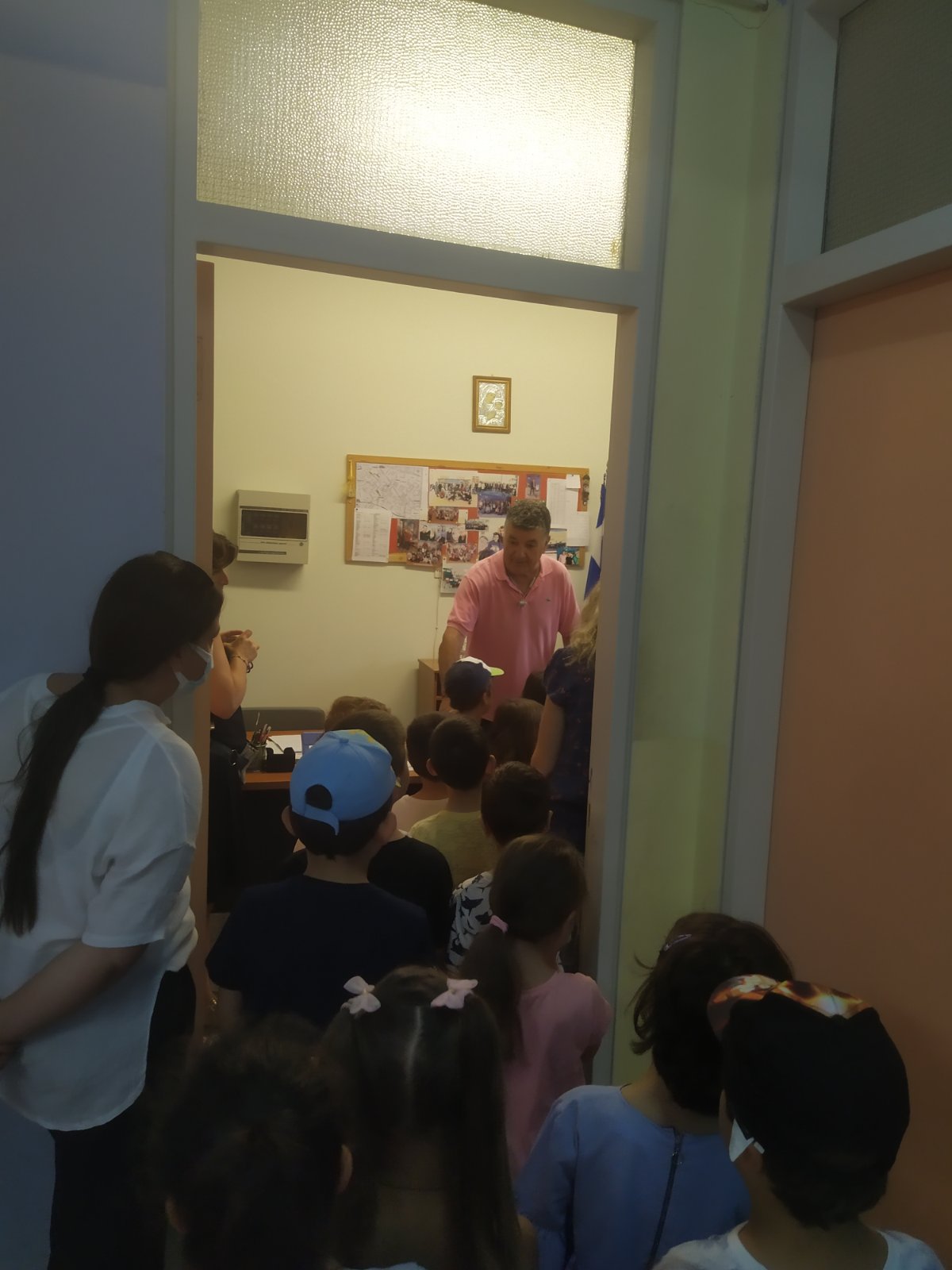 Μπήκαμε μέσα στην τάξη της Πρώτης Δημοτικού, είδαμε τους μαθητές να κάθονται στα θρανία και γνωρίσαμε την δασκάλα τους την Κα Λίτσα. Τους χαρίσαμε βιβλίο με τις ζωγραφιές μας και τα ονόματά μας.