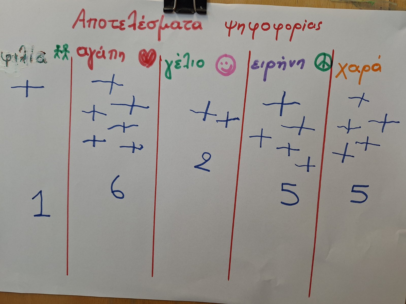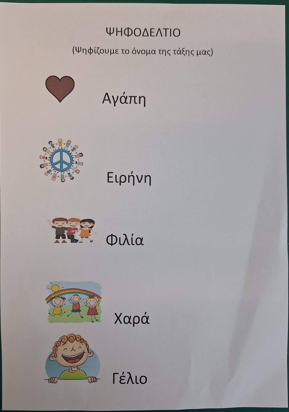 Φτιάξαμε ψηφοδέλτια, κάλπη, ορίσαμε εφορευτική επιτροπή και ψηφίσαμε το όνομα της τάξης. Αποτυπώσαμε τα αποτελέσματα σε ένα μεγάλο χαρτί και η τάξη μας ονομάστηκε Η τάξη της αγάπης.