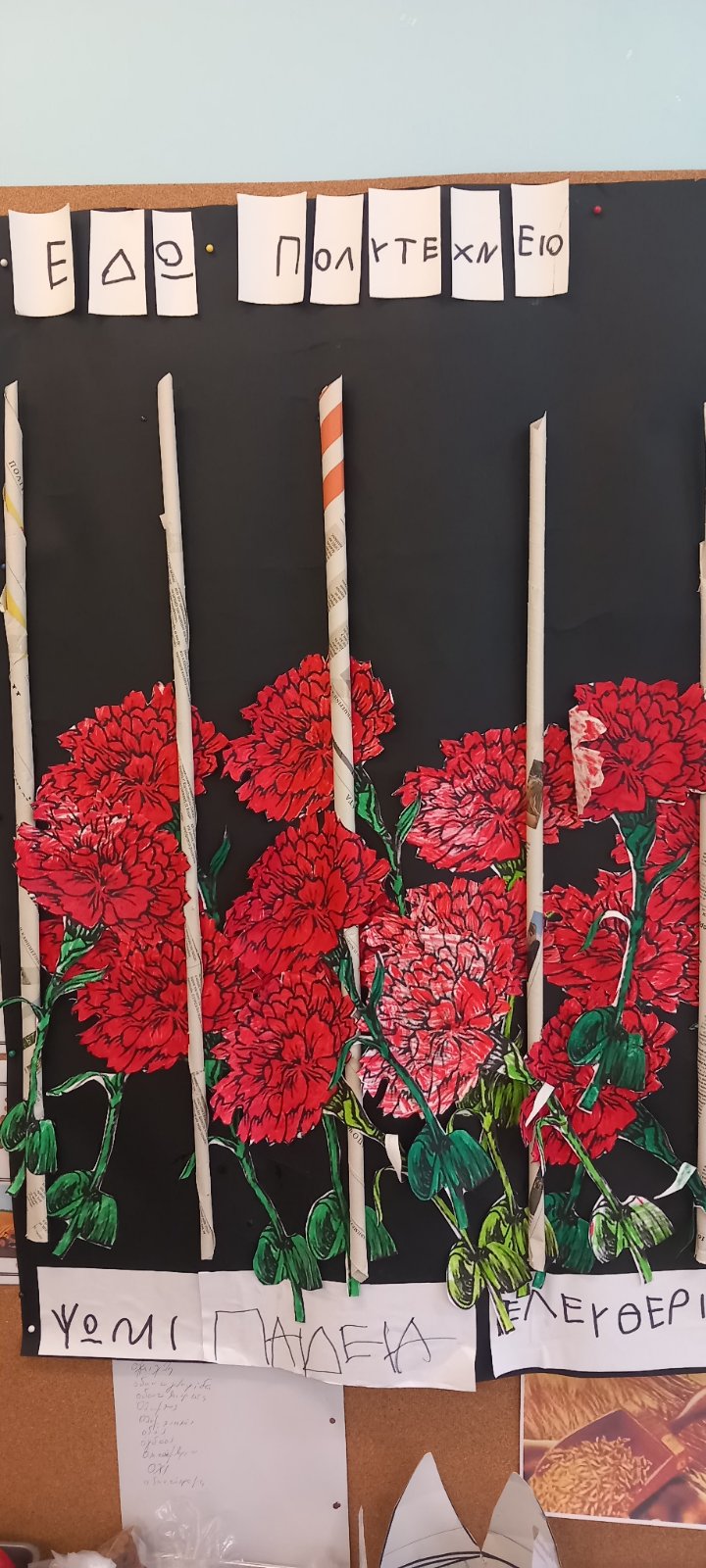 Φτιάξαμε ένα κάδρο με το αιώνιο σύμβολο της εξέγερσης του Πολυτεχνείου, ένα γαρύφαλλο, ζωγραφίζοντάς το πάνω στο χέρι ενός παιδιού που το “προσφέρει” σε όσους αγωνίστηκαν με θάρρος για τις αξίες της ελευθερίας και της δημοκρατίας.