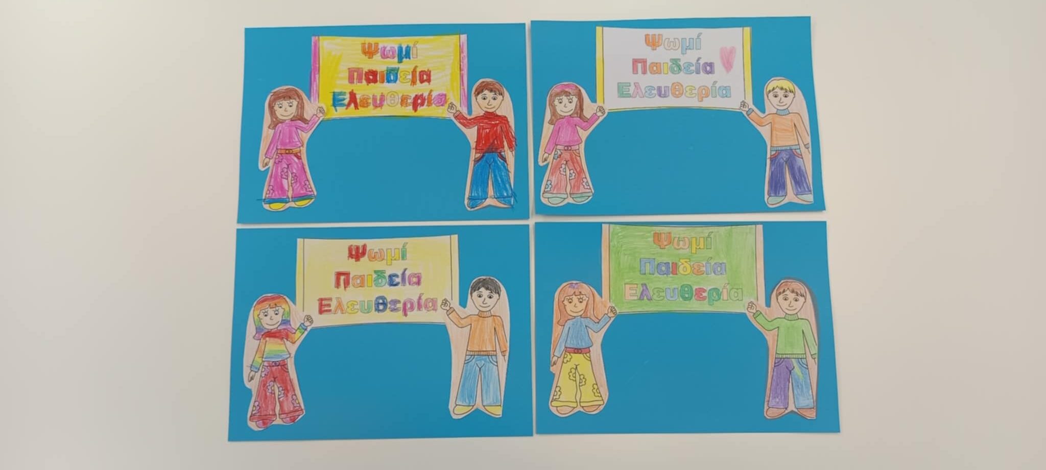 Στη συνέχεια, ζωγραφίσαμε με τις ξυλομπογιές μας το πανό με το χαρακτηριστικό σύνθημα της εξέγερσης του Πολυτεχνείου “ΨΩΜΙ-ΠΑΙΔΕΙΑ-ΕΛΕΥΘΕΡΙΑ” και εξηγήσαμε το νόημα κάθε μίας από αυτές τις λέξεις.